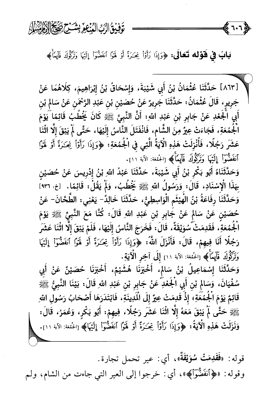 [٨٦٣] حَدَّثَنَا عُثْمَانُ بْنُ أَبِي شَيْبَةَ، وَإِسْحَاقُ بْنُ إِبْرَاهِيمَ، كِلَاهُمَا عَنْ جَرِيرٍ، قَالَ عُثْمَانُ: حَدَّثَنَا جَرِيرٌ عَنْ حُصَيْنِ بْنِ عَبْدِ الرَّحْمَنِ عَنْ سَالِمِ بْنِ أَبِي الْجَعْدِ عَنْ جَابِرِ بْنِ عَبْدِ اللهِ: أَنَّ النَّبِيَّ صلى الله عليه وسلم كَانَ يَخْطُبُ قَائِمًا يَوْمَ الْجُمُعَةِ، فَجَاءَتْ عِيرٌ مِنْ الشَّامِ، فَانْفَتَلَ النَّاسُ إِلَيْهَا، حَتَّى لَمْ يَبْقَ إِلَّا اثْنَا عَشَرَ رَجُلًا، فَأُنْزِلَتْ هَذِهِ الْآيَةُ الَّتِي فِي الْجُمُعَةِ: {وَإِذَا رَأَوْا تِجَارَةً أَوْ لَهْوًا انْفَضُّوا إِلَيْهَا وَتَرَكُوكَ قَائِمًا}.