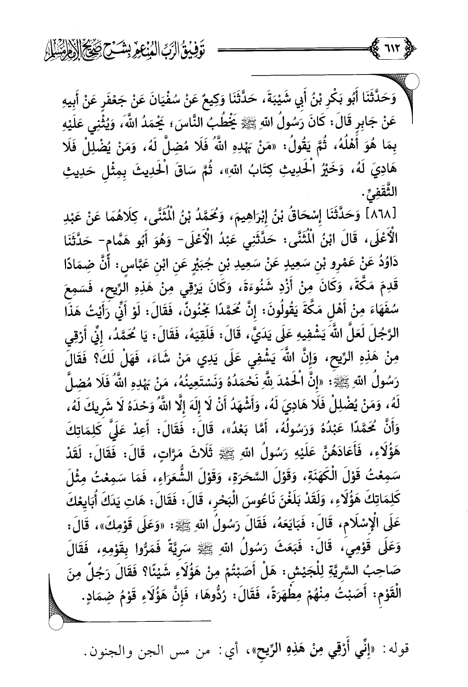 [٨٦٨] وَحَدَّثَنَا إِسْحَاقُ بْنُ إِبْرَاهِيمَ، وَمُحَمَّدُ بْنُ الْمُثَنَّى، كِلَاهُمَا عَنْ عَبْدِ الْأَعْلَى، قَالَ ابْنُ الْمُثَنَّى: حَدَّثَنِي عَبْدُ الْأَعْلَى- وَهُوَ أَبُو هَمَّامٍ- حَدَّثَنَا دَاوُدُ عَنْ عَمْرِو بْنِ، سَعِيدٍ عَنْ سَعِيدِ بْنِ جُبَيْرٍ عَنِ ابْنِ عَبَّاسٍ: أَنَّ ضِمَادًا قَدِمَ مَكَّةَ، وَكَانَ مِنْ أَزْدِ شَنُوءَةَ، وَكَانَ يَرْقِي مِنْ هَذِهِ الرِّيحِ، فَسَمِعَ سُفَهَاءَ مِنْ أَهْلِ مَكَّةَ يَقُولُونَ: إِنَّ مُحَمَّدًا مَجْنُونٌ، فَقَالَ: لَوْ أَنِّي رَأَيْتُ هَذَا الرَّجُلَ لَعَلَّ اللَّهَ يَشْفِيهِ عَلَى يَدَيَّ، قَالَ: فَلَقِيَهُ، فَقَالَ: يَا مُحَمَّدُ، إِنِّي أَرْقِي مِنْ هَذِهِ الرِّيحِ، وَإِنَّ اللَّهَ يَشْفِي عَلَى يَدِي مَنْ شَاءَ، فَهَلْ لَكَ؟ فَقَالَ رَسُولُ اللهِ صلى الله عليه وسلم: ((إِنَّ الْحَمْدَ لِلَّهِ نَحْمَدُهُ وَنَسْتَعِينُهُ، مَنْ يَهْدِهِ اللَّهُ فَلَا مُضِلَّ لَهُ، وَمَنْ يُضْلِلْ فَلَا هَادِيَ لَهُ، وَأَشْهَدُ أَنْ لَا إِلَهَ إِلَّا اللَّهُ وَحْدَهُ لَا شَرِيكَ لَهُ، وَأَنَّ مُحَمَّدًا عَبْدُهُ وَرَسُولُهُ، أَمَّا بَعْدُ))، قَالَ: فَقَالَ: أَعِدْ عَلَيَّ كَلِمَاتِكَ هَؤُلَاءِ، فَأَعَادَهُنَّ عَلَيْهِ رَسُولُ اللهِ صلى الله عليه وسلم ثَلَاثَ مَرَّاتٍ، قَالَ: فَقَالَ: لَقَدْ سَمِعْتُ قَوْلَ الْكَهَنَةِ، وَقَوْلَ السَّحَرَةِ، وَقَوْلَ الشُّعَرَاءِ، فَمَا سَمِعْتُ مِثْلَ كَلِمَاتِكَ هَؤُلَاءِ، وَلَقَدْ بَلَغْنَ نَاعُوسَ الْبَحْرِ، قَالَ: فَقَالَ: هَاتِ يَدَكَ أُبَايِعْكَ عَلَى الْإِسْلَامِ، قَالَ: فَبَايَعَهُ، فَقَالَ رَسُولُ اللهِ صلى الله عليه وسلم: ((وَعَلَى قَوْمِكَ))، قَالَ: وَعَلَى قَوْمِي، قَالَ: فَبَعَثَ رَسُولُ اللهِ صلى الله عليه وسلم سَرِيَّةً فَمَرُّوا بِقَوْمِهِ، فَقَالَ صَاحِبُ السَّرِيَّةِ لِلْجَيْشِ: هَلْ