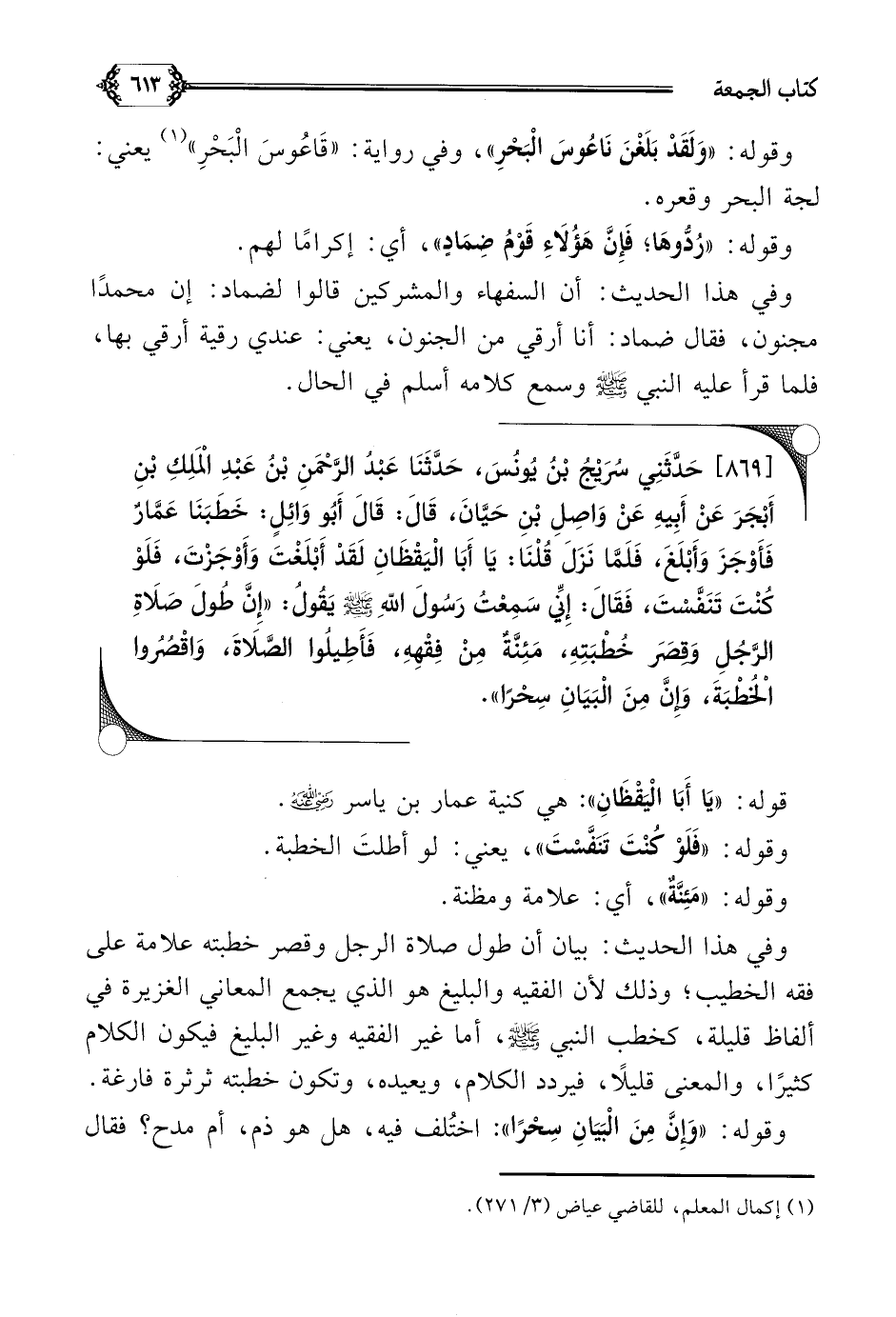 [٨٦٩] حَدَّثَنِي سُرَيْجُ بْنُ يُونُسَ، حَدَّثَنَا عَبْدُ الرَّحْمَنِ بْنُ عَبْدِ الْمَلِكِ بْنِ أَبْجَرَ عَنْ أَبِيهِ عَنْ وَاصِلِ بْنِ حَيَّانَ، قَالَ: قَالَ أَبُو وَائِلٍ: خَطَبَنَا عَمَّارٌ فَأَوْجَزَ وَأَبْلَغَ، فَلَمَّا نَزَلَ قُلْنَا: يَا أَبَا الْيَقْظَانِ لَقَدْ أَبْلَغْتَ وَأَوْجَزْتَ، فَلَوْ كُنْتَ تَنَفَّسْتَ، فَقَالَ: إِنِّي سَمِعْتُ رَسُولَ اللهِ صلى الله عليه وسلم يَقُولُ: ((إِنَّ طُولَ صَلَاةِ الرَّجُلِ وَقِصَرَ خُطْبَتِهِ، مَئِنَّةٌ مِنْ فِقْهِهِ، فَأَطِيلُوا الصَّلَاةَ، وَاقْصُرُوا الْخُطْبَةَ، وَإِنَّ مِنَ الْبَيَانِ سِحْرًا)).