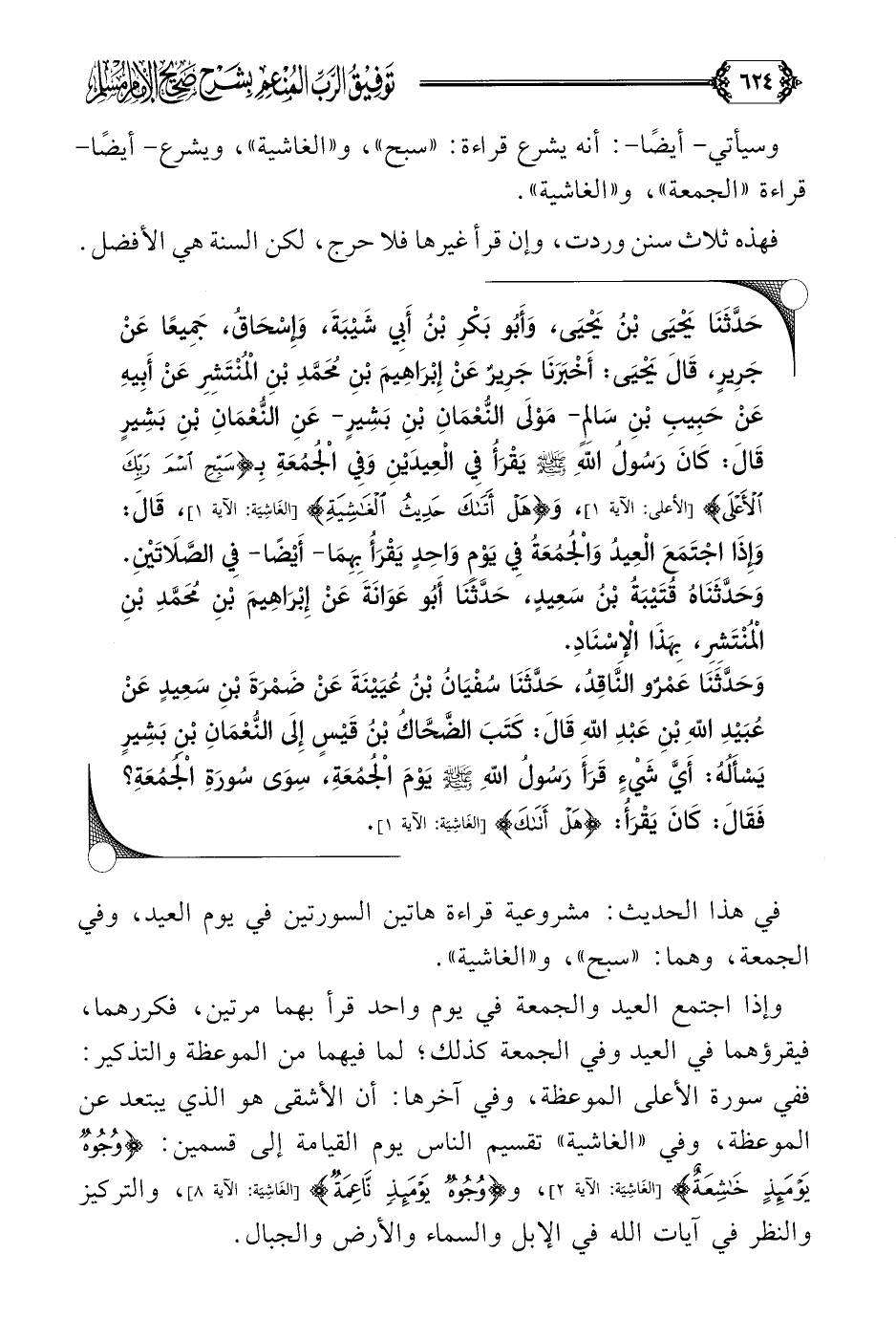 حَدَّثَنَا يَحْيَى بْنُ يَحْيَى، وَأَبُو بَكْرِ بْنُ أَبِي شَيْبَةَ، وَإِسْحَاقُ، جَمِيعًا عَنْ جَرِيرٍ، قَالَ يَحْيَى: أَخْبَرَنَا جَرِيرٌ عَنْ إِبْرَاهِيمَ بْنِ مُحَمَّدِ بْنِ الْمُنْتَشِرِ عَنْ أَبِيهِ عَنْ حَبِيبِ بْنِ سَالِمٍ- مَوْلَى النُّعْمَانِ بْنِ بَشِيرٍ- عَنْ النُّعْمَانِ بْنِ بَشِيرٍ قَالَ: كَانَ رَسُولُ اللهِ صلى الله عليه وسلم يَقْرَأُ فِي الْعِيدَيْنِ وَفِي الْجُمُعَةِ بِـ {سَبِّحِ اسْمَ رَبِّكَ الْأَعْلَى}، وَ {هَلْ أَتَاكَ حَدِيثُ الْغَاشِيَةِ}، قَالَ: وَإِذَا اجْتَمَعَ الْعِيدُ وَالْجُمُعَةُ فِي يَوْمٍ وَاحِدٍ يَقْرَأُ بِهِمَا- أَيْضًا- فِي الصَّلَاتَيْنِ.