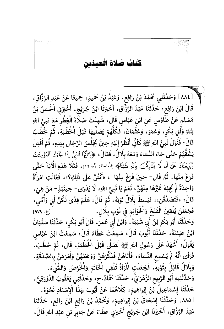 [٨٨٤] وَحَدَّثَنِي مُحَمَّدُ بْنُ رَافِعٍ، وَعَبْدُ بْنُ حُمَيدٍ، جميعًا عَنْ عَبْدِ الرَّزَّاقِ، قَالَ ابْنُ رَافِعٍ: حَدَّثَنَا عَبْدُ الرَّزَّاقِ، أَخْبَرَنَا ابْنُ جُرَيْجٍ، أَخْبَرَنِي الْحَسَنُ ابْنُ مُسْلِمٍ عَنْ طَاوُسٍ عَنِ ابْنِ عَبَّاسٍ قَالَ: شَهِدْتُ صَلَاةَ الْفِطْرِ مَعَ نَبِيِّ اللَّهِ صلى الله عليه وسلم وَأَبِي بَكْرٍ، وَعُمَرَ، وَعُثْمَانَ، فَكُلُّهُمْ يُصَلِّيهَا قَبْلَ الْخُطْبَةِ، ثُمَّ يَخْطُبُ قَالَ: فَنَزَلَ نَبِيُّ اللَّهِ صلى الله عليه وسلم كَأَنِّي أَنْظُرُ إِلَيْهِ حِينَ يُجَلِّسُ الرِّجَالَ بِيَدِهِ، ثُمَّ أَقْبَلَ يَشُقُّهُمْ حَتَّى جَاءَ النِّسَاءَ وَمَعَهُ بِلَالٌ، فَقَالَ: {يَأَيُّهَا النَّبِيُّ إِذَا جَاءَكَ الْمُؤْمِنَاتُ يُبَايِعْنَكَ عَلَى أَنْ لا يُشْرِكْنَ بِاللَّهِ شَيْئًا}، فَتَلَا هَذِهِ الْآيَةَ حَتَّى فَرَغَ مِنْهَا، ثُمَّ قَالَ حِينَ فَرَغَ مِنْهَا: ((أَنْتُنَّ عَلَى ذَلِكِ؟ ))، فَقَالَتِ امْرَأَةٌ وَاحِدَةٌ لَمْ يُجِبْهُ غَيْرُهَا مِنْهُنَّ: نَعَمْ يَا نَبِيَّ اللَّهِ، لَا يُدْرَى- حِينَئِذٍ- مَنْ هِيَ قَالَ: ((فَتَصَدَّقْنَ))، فَبَسَطَ بِلَالٌ ثَوْبَهُ، ثُمَّ قَالَ: هَلُمَّ فِدًى لَكُنَّ أَبِي وَأُمِّي، فَجَعَلْنَ يُلْقِينَ الْفَتَخَ وَالْخَوَاتِمَ فِي ثَوْبِ بِلَالٍ.