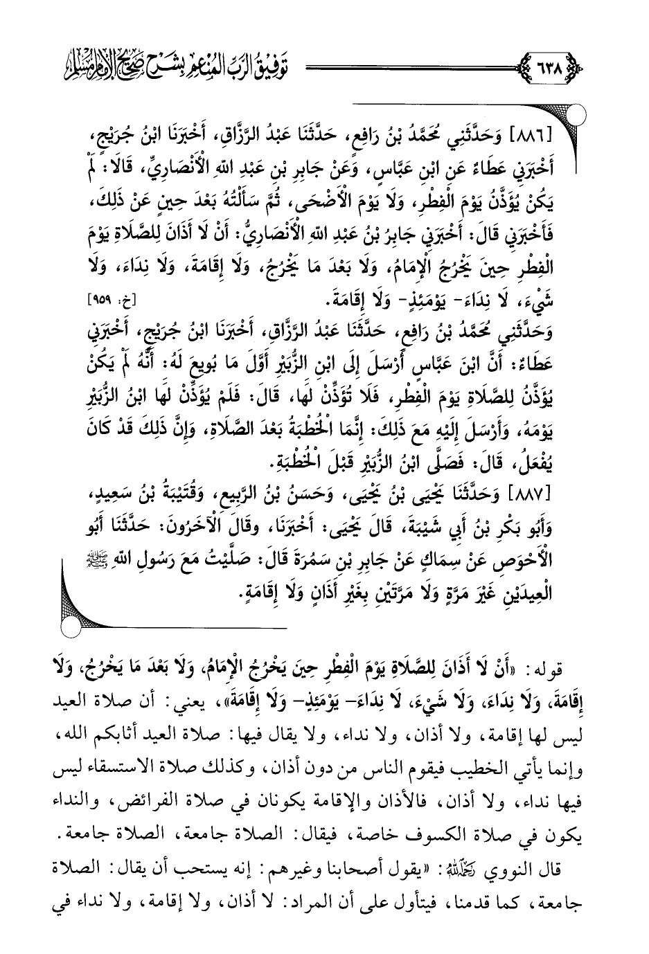 قوله: ((أَنْ لَا أَذَانَ لِلصَّلَاةِ يَوْمَ الْفِطْرِ حِينَ يَخْرُجُ الْإِمَامُ، وَلَا بَعْدَ مَا يَخْرُجُ، وَلَا إِقَامَةَ، وَلَا نِدَاءَ، وَلَا شَيْءَ، لَا نِدَاءَ- يَوْمَئِذٍ- وَلَا إِقَامَةَ))، يعني: أن صلاة العيد ليس لها إقامة، ولا أذان، ولا نداء، ولا يقال فيها: صلاة العيد أثابكم الله، وإنما يأتي الخطيب فيقوم الناس من دون أذان، وكذلك صلاة الاستسقاء ليس فيها نداء، ولا أذان، فالأذان والإقامة يكونان في صلاة الفرائض، والنداء يكون في صلاة الكسوف خاصة، فيقال: الصلاة جامعة، الصلاة جامعة.