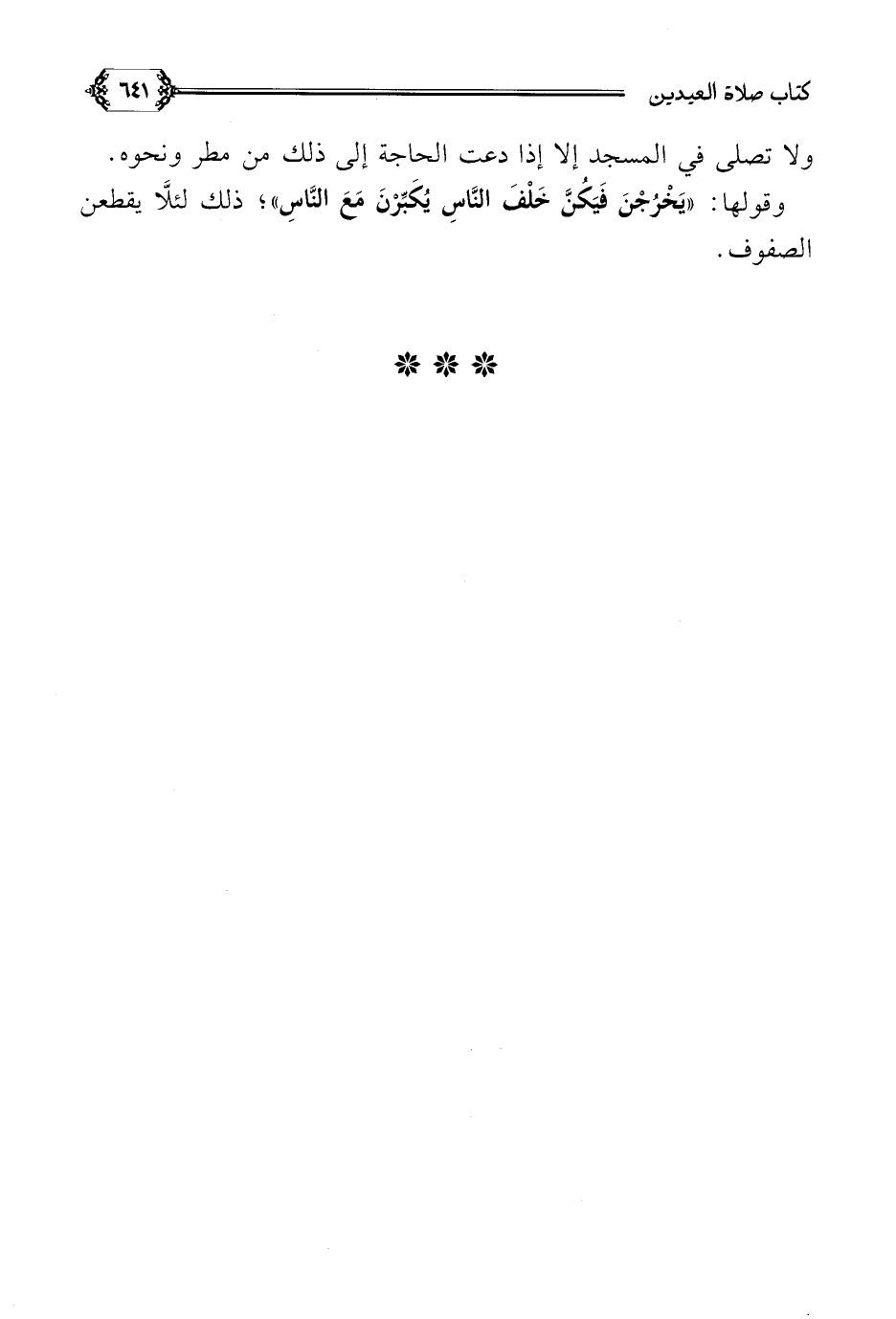 وقولها: ((يَخْرُجْنَ فَيَكُنَّ خَلْفَ النَّاسِ يُكَبِّرْنَ مَعَ النَّاسِ))؛ ذلك لئلَّا يقطعن الصفوف.