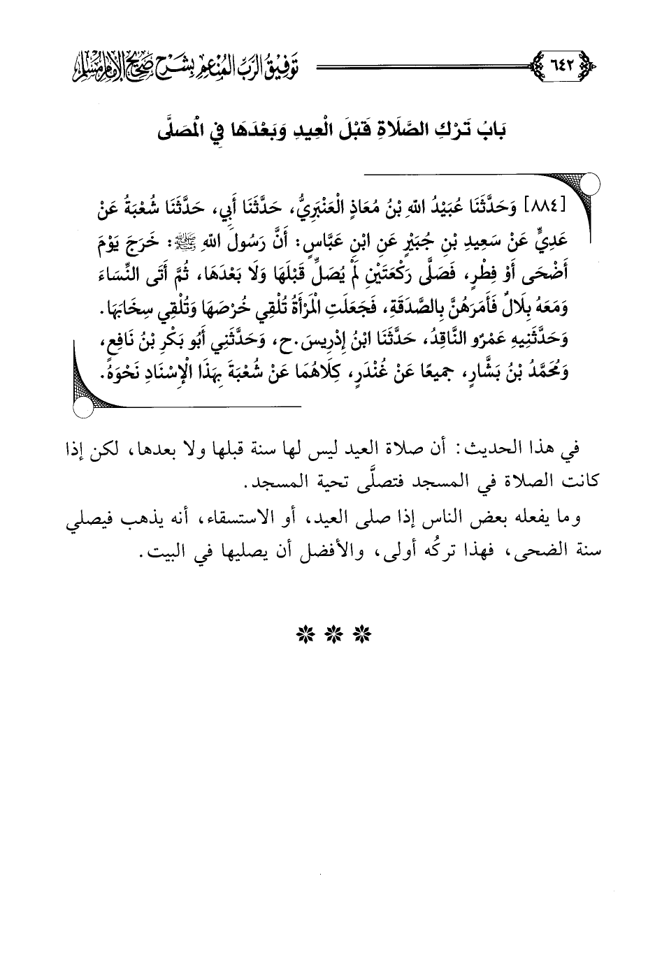 في هذا الحديث: أن صلاة العيد ليس لها سنة قبلها ولا بعدها، لكن إذا كانت الصلاة في المسجد فتصلَّى تحية المسجد.