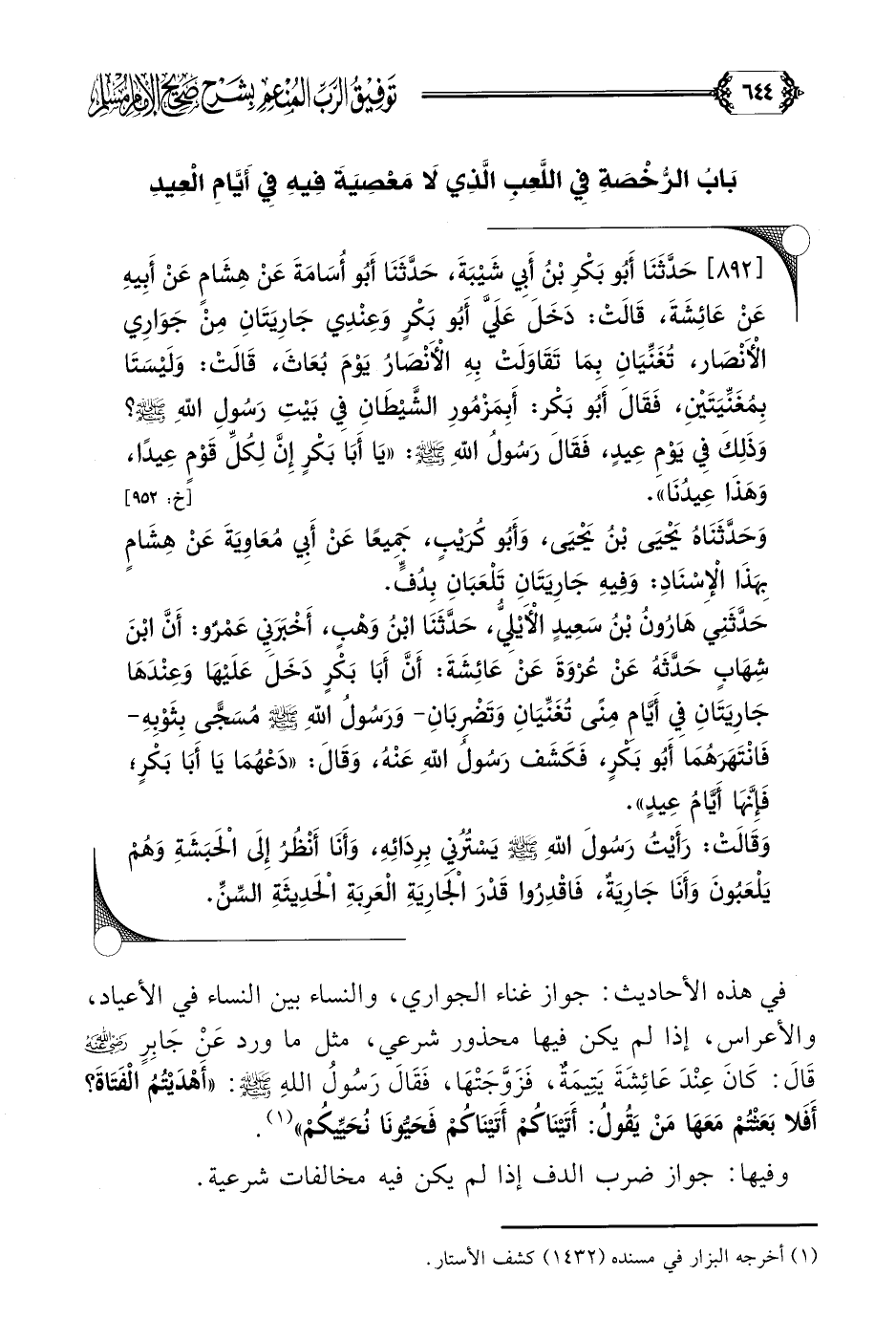 [٨٩٢] حَدَّثَنَا أَبُو بَكْرِ بْنُ أَبِي شَيْبَةَ، حَدَّثَنَا أَبُو أُسَامَةَ عَنْ هِشَامٍ عَنْ أَبِيهِ عَنْ عَائِشَةَ، قَالَتْ: دَخَلَ عَلَيَّ أَبُو بَكْرٍ وَعِنْدِي جَارِيَتَانِ مِنْ جَوَارِي الْأَنْصَار، تُغَنِّيَانِ بِمَا تَقَاوَلَتْ بِهِ الْأَنْصَارُ يَوْمَ بُعَاثَ، قَالَتْ: وَلَيْسَتَا بِمُغَنِّيَتَيْنِ، فَقَالَ أَبُو بَكْر: أَبِمَزْمُورِ الشَّيْطَانِ فِي بَيْتِ رَسُولِ اللَّهِ صلى الله عليه وسلم؟ وَذَلِكَ فِي يَوْمِ عِيدٍ، فَقَالَ رَسُولُ اللَّهِ صلى الله عليه وسلم: ((يَا أَبَا بَكْرٍ إِنَّ لِكُلِّ قَوْمٍ عِيدًا، وَهَذَا عِيدُنَا)).