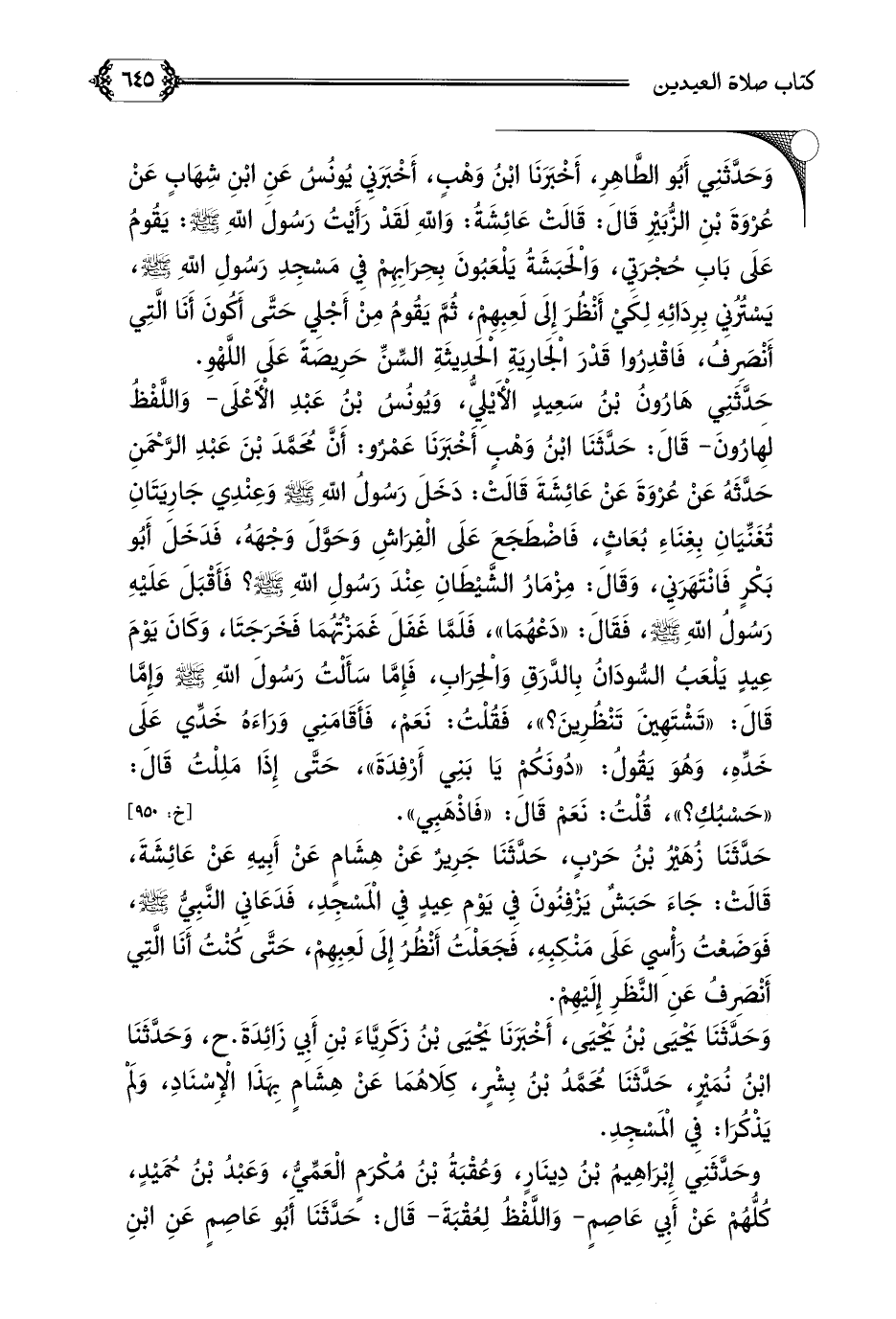 حَدَّثَنِي هَارُونُ بْنُ سَعِيدٍ الْأَيْلِيُّ، وَيُونُسُ بْنُ عَبْدِ الْأَعْلَى- وَاللَّفْظُ لِهَارُونَ- قَالَ: حَدَّثَنَا ابْنُ وَهْبٍ أَخْبَرَنَا عَمْرٌو: أَنَّ مُحَمَّدَ بْنَ عَبْدِ الرَّحْمَنِ حَدَّثَهُ عَنْ عُرْوَةَ عَنْ عَائِشَةَ قَالَتْ: دَخَلَ رَسُولُ اللَّهِ صلى الله عليه وسلم وَعِنْدِي جَارِيَتَانِ تُغَنِّيَانِ بِغِنَاءِ بُعَاثٍ، فَاضْطَجَعَ عَلَى الْفِرَاشِ وَحَوَّلَ وَجْهَهُ، فَدَخَلَ أَبُو بَكْرٍ فَانْتَهَرَنِي، وَقَالَ: مِزْمَارُ الشَّيْطَانِ عِنْدَ رَسُولِ اللَّهِ صلى الله عليه وسلم؟ فَأَقْبَلَ عَلَيْهِ رَسُولُ اللَّهِ صلى الله عليه وسلم، فَقَالَ: ((دَعْهُمَا))، فَلَمَّا غَفَلَ غَمَزْتُهُمَا فَخَرَجَتَا، وَكَانَ يَوْمَ عِيدٍ يَلْعَبُ السُّودَانُ بِالدَّرَقِ وَالْحِرَابِ، فَإِمَّا سَأَلْتُ رَسُولَ اللَّهِ صلى الله عليه وسلم وَإِمَّا قَالَ: ((تَشْتَهِينَ تَنْظُرِينَ؟ ))، فَقُلْتُ: نَعَمْ، فَأَقَامَنِي وَرَاءَهُ خَدِّي عَلَى خَدِّهِ، وَهُوَ يَقُولُ: ((دُونَكُمْ يَا بَنِي أَرْفِدَةَ))، حَتَّى إِذَا مَلِلْتُ قَالَ: ((حَسْبُكِ؟ ))، قُلْتُ: نَعَمْ قَالَ: ((فَاذْهَبِي)).