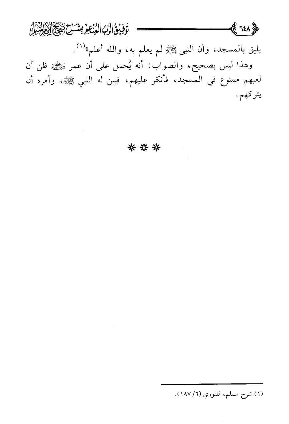 وهذا ليس بصحيح، والصواب: أنه يُحمل على أن عمر رضي الله عنه ظن أن لعبهم ممنوع في المسجد، فأنكر عليهم، فبين له النبي صلى الله عليه وسلم، وأمره أن يتركهم.