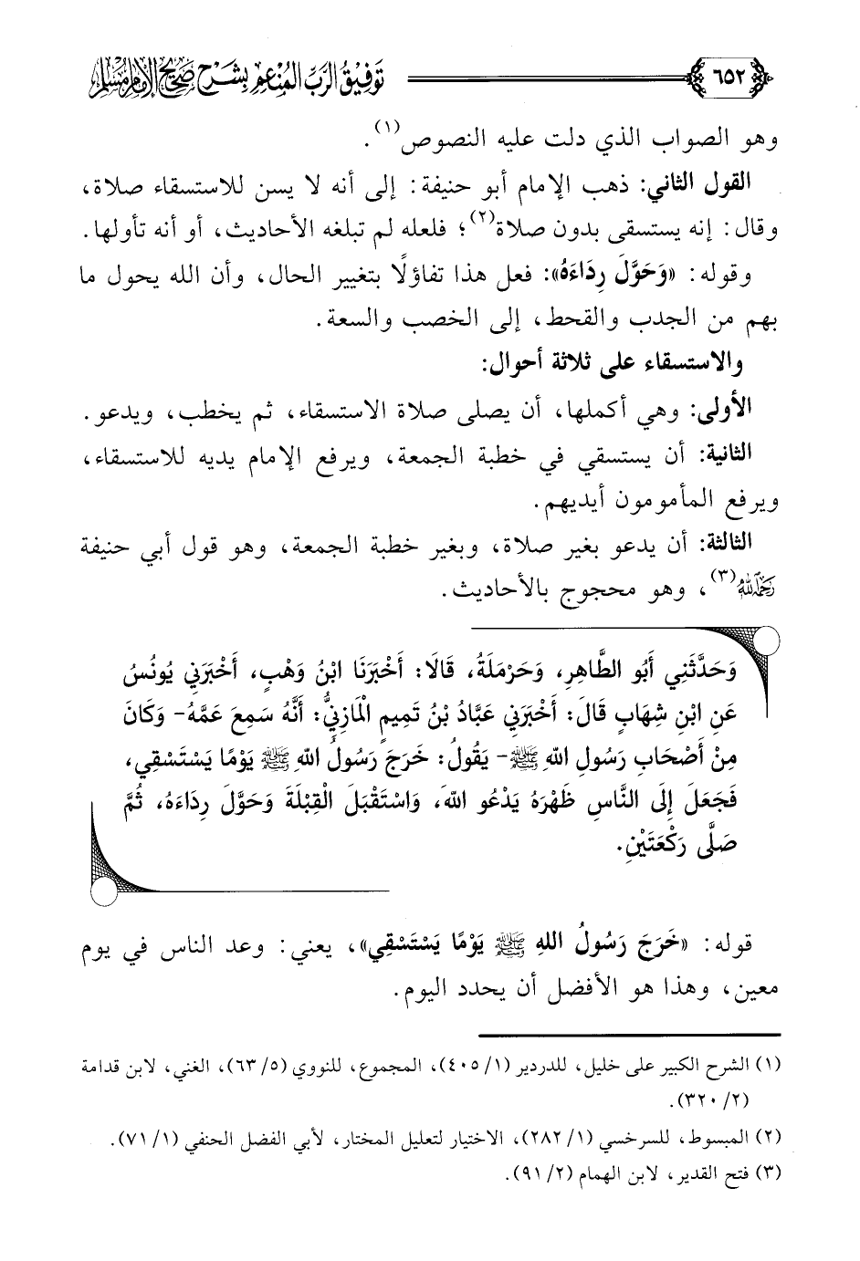 القول الثاني: ذهب الإمام أبو حنيفة: إلى أنه لا يسن للاستسقاء صلاة، وقال: إنه يستسقى بدون صلاة (¬٢)؛ فلعله لم تبلغه الأحاديث، أو أنه تأولها.