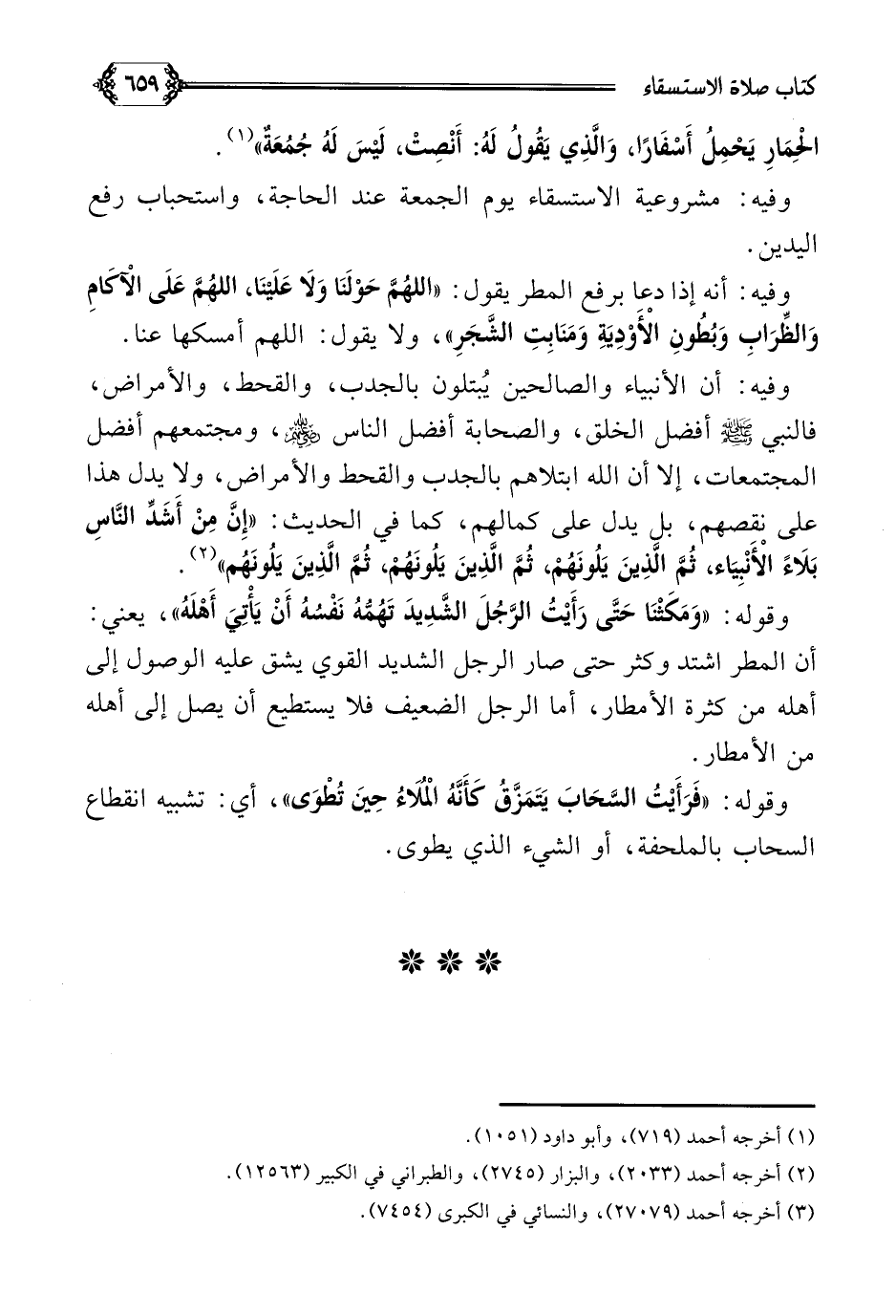 وفيه: أنه إذا دعا برفع المطر يقول: ((اللَّهُمَّ حَوْلَنَا وَلَا عَلَيْنَا، اللَّهُمَّ عَلَى الْآكَامِ وَالظِّرَابِ وَبُطُونِ الْأَوْدِيَةِ وَمَنَابِتِ الشَّجَرِ))، ولا يقول: اللهم أمسكها عنا.
