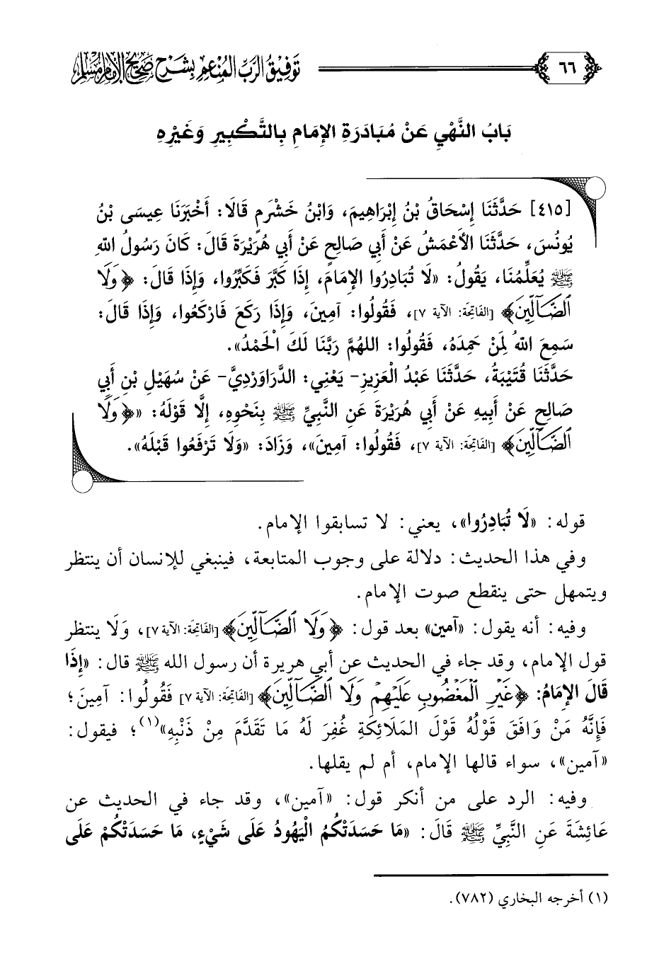 [٤١٥] حَدَّثَنَا إِسْحَاقُ بْنُ إِبْرَاهِيمَ، وَابْنُ خَشْرَمٍ قَالَا: أَخْبَرَنَا عِيسَى بْنُ يُونُسَ، حَدَّثَنَا الأَعْمَشُ عَنْ أَبِي صَالِحٍ عَنْ أَبِي هُرَيْرَةَ قَالَ: كَانَ رَسُولُ اللَّهِ صلى الله عليه وسلم يُعَلِّمُنَا، يَقُولُ: ((لَا تُبَادِرُوا الإِمَامَ، إِذَا كَبَّرَ فَكَبِّرُوا، وَإِذَا قَالَ: {وَلا الضَّالِّينَ}، فَقُولُوا: آمِينَ، وَإِذَا رَكَعَ فَارْكَعُوا، وَإِذَا قَالَ: سَمِعَ اللَّهُ لِمَنْ حَمِدَهُ، فَقُولُوا: اللَّهُمَّ رَبَّنَا لَكَ الْحَمْدُ)).