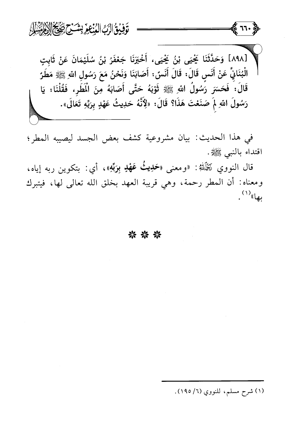 [٨٩٨] وَحَدَّثَنَا يَحْيَى بْنُ يَحْيَى، أَخْبَرَنَا جَعْفَرُ بْنُ سُلَيْمَانَ عَنْ ثَابِتٍ الْبُنَانِيِّ عَنْ أَنَسٍ قَالَ: قَالَ أَنَسٌ: أَصَابَنَا وَنَحْنُ مَعَ رَسُولِ اللَّهِ صلى الله عليه وسلم مَطَرٌ قَالَ: فَحَسَرَ رَسُولُ اللَّهِ صلى الله عليه وسلم ثَوْبَهُ حَتَّى أَصَابَهُ مِنَ الْمَطَرِ، فَقُلْنَا: يَا رَسُولَ اللَّهِ لِمَ صَنَعْتَ هَذَا؟ قَالَ: ((لِأَنَّهُ حَدِيثُ عَهْدٍ بِرَبِّهِ تَعَالَى)).