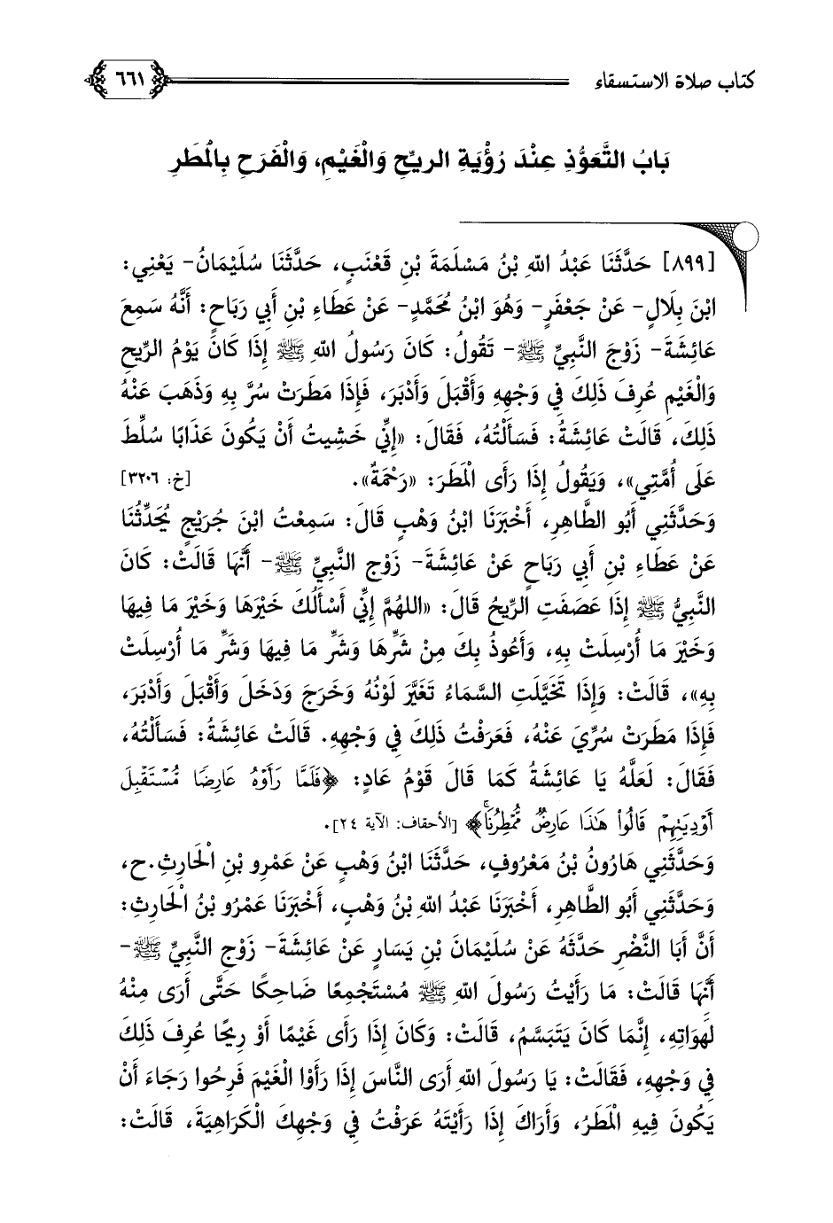 [٨٩٩] حَدَّثَنَا عَبْدُ اللَّهِ بْنُ مَسْلَمَةَ بْنِ قَعْنَبٍ، حَدَّثَنَا سُلَيْمَانُ- يَعْنِي: ابْنَ بِلَالٍ- عَنْ جَعْفَرٍ- وَهُوَ ابْنُ مُحَمَّدٍ- عَنْ عَطَاءِ بْنِ أَبِي رَبَاحٍ: أَنَّهُ سَمِعَ عَائِشَةَ- زَوْجَ النَّبِيِّ صلى الله عليه وسلم- تَقُولُ: كَانَ رَسُولُ اللَّهِ صلى الله عليه وسلم إِذَا كَانَ يَوْمُ الرِّيحِ وَالْغَيْمِ عُرِفَ ذَلِكَ فِي وَجْهِهِ وَأَقْبَلَ وَأَدْبَرَ، فَإِذَا مَطَرَتْ سُرَّ بِهِ وَذَهَبَ عَنْهُ ذَلِكَ، قَالَتْ عَائِشَةُ: فَسَأَلْتُهُ، فَقَالَ: ((إِنِّي خَشِيتُ أَنْ يَكُونَ عَذَابًا سُلِّطَ عَلَى أُمَّتِي))، وَيَقُولُ إِذَا رَأَى الْمَطَرَ: ((رَحْمَةٌ)).