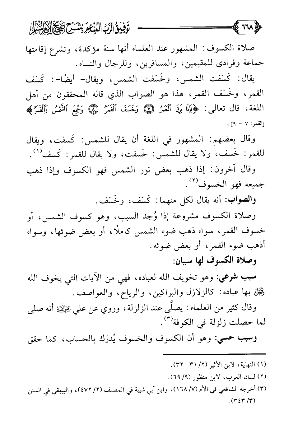 يقال: كَسَفت الشمس، وخَسَفت الشمس، ويقال- أيضًا-: كَسَف القمر، وخَسَف القمر، هذا هو الصواب الذي قاله المحققون من أهل اللغة، قال تعالى: {فَإِذَا بَرِقَ الْبَصَرُ وَخَسَفَ الْقَمَرُ وَجُمِعَ الشَّمْسُ وَالْقَمَرُ}.