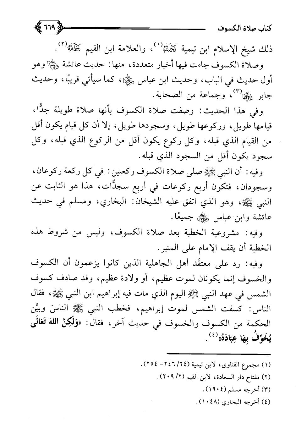 وفيه: أن النبي صلى الله عليه وسلم صلى صلاة الكسوف ركعتين: في كل ركعة ركوعان، وسجودان، فتكون أربع ركوعات في أربع سجدات، هذا هو الثابت عن النبي صلى الله عليه وسلم، وهو الذي اتفق عليه الشيخان: البخاري، ومسلم في حديث عائشة وابن عباس رضي الله عنهم جميعًا.