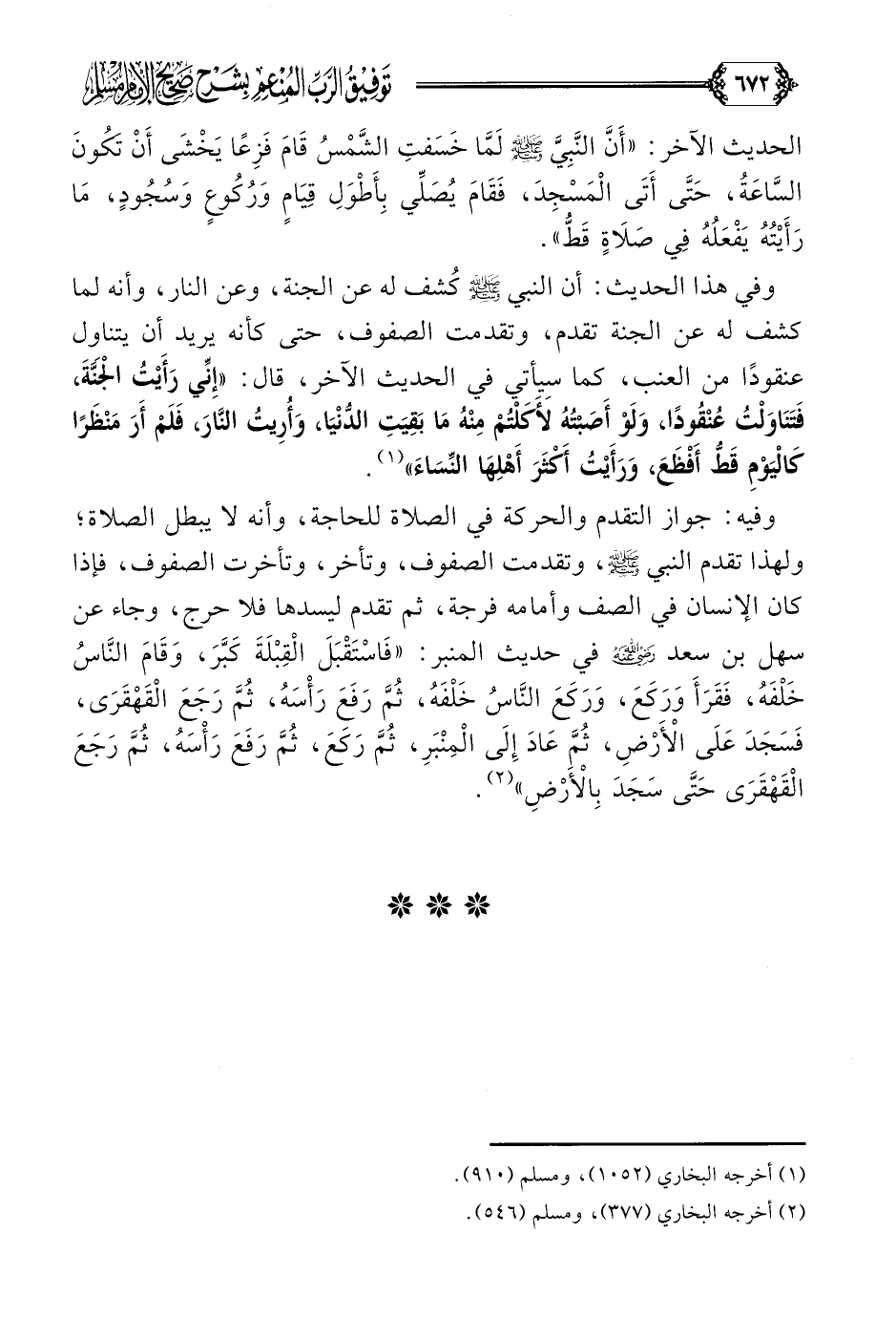 وفيه: جواز التقدم والحركة في الصلاة للحاجة، وأنه لا يبطل الصلاة؛ ولهذا تقدم النبي صلى الله عليه وسلم، وتقدمت الصفوف، وتأخر، وتأخرت الصفوف، فإذا كان الإنسان في الصف وأمامه فرجة، ثم تقدم ليسدها فلا حرج، وجاء عن سهل بن سعد رضي الله عنه في حديث المنبر: ((فَاسْتَقْبَلَ الْقِبْلَةَ كَبَّرَ، وَقَامَ النَّاسُ خَلْفَهُ، فَقَرَأَ وَرَكَعَ، وَرَكَعَ النَّاسُ خَلْفَهُ، ثُمَّ رَفَعَ رَأْسَهُ، ثُمَّ رَجَعَ الْقَهْقَرَى، فَسَجَدَ عَلَى الْأَرْضِ، ثُمَّ عَادَ إِلَى الْمِنْبَرِ، ثُمَّ رَكَعَ، ثُمَّ رَفَعَ رَأْسَهُ، ثُمَّ رَجَعَ الْقَهْقَرَى حَتَّى سَجَدَ بِالْأَرْضِ)) (¬٢).