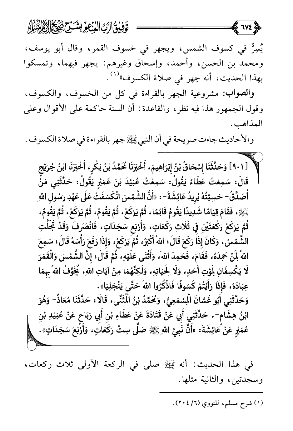 والصواب: مشروعية الجهر بالقراءة في كل من الخسوف، والكسوف، وقول الجمهور هذا فيه نظر، والقاعدة: أن السنة حاكمة على الأقوال وعلى المذاهب.