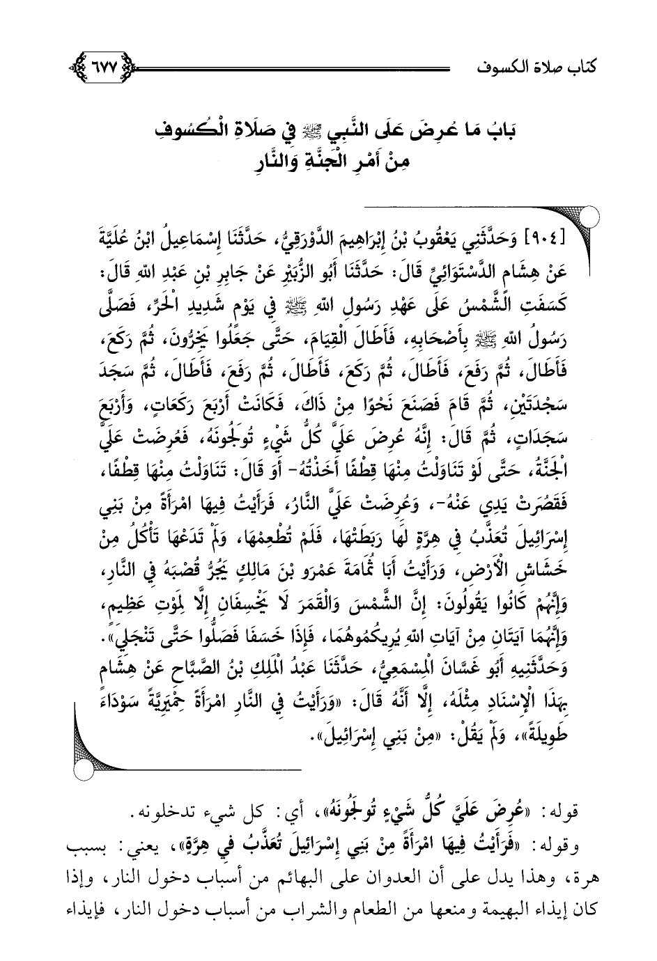 [٩٠٤] وَحَدَّثَنِي يَعْقُوبُ بْنُ إِبْرَاهِيمَ الدَّوْرَقِيُّ، حَدَّثَنَا إِسْمَاعِيلُ ابْنُ عُلَيَّةَ عَنْ هِشَامٍ الدَّسْتَوَائِيِّ قَالَ: حَدَّثَنَا أَبُو الزُّبَيْرِ عَنْ جَابِرِ بْنِ عَبْدِ اللَّهِ قَالَ: كَسَفَتِ الشَّمْسُ عَلَى عَهْدِ رَسُولِ اللَّهِ صلى الله عليه وسلم فِي يَوْمٍ شَدِيدِ الْحَرِّ، فَصَلَّى رَسُولُ اللَّهِ صلى الله عليه وسلم بِأَصْحَابِهِ، فَأَطَالَ الْقِيَامَ، حَتَّى جَعَلُوا يَخِرُّونَ، ثُمَّ رَكَعَ، فَأَطَالَ، ثُمَّ رَفَعَ، فَأَطَالَ، ثُمَّ رَكَعَ، فَأَطَالَ، ثُمَّ رَفَعَ، فَأَطَالَ، ثُمَّ سَجَدَ سَجْدَتَيْنِ، ثُمَّ قَامَ فَصَنَعَ نَحْوًا مِنْ ذَاكَ، فَكَانَتْ أَرْبَعَ رَكَعَاتٍ، وَأَرْبَعَ سَجَدَاتٍ، ثُمَّ قَالَ: إِنَّهُ عُرِضَ عَلَيَّ كُلُّ شَيْءٍ تُولَجُونَهُ، فَعُرِضَتْ عَلَيَّ الْجَنَّةُ، حَتَّى لَوْ تَنَاوَلْتُ مِنْهَا قِطْفًا أَخَذْتُهُ- أَوَ قَالَ: تَنَاوَلْتُ مِنْهَا قِطْفًا، فَقَصُرَتْ يَدِي عَنْهُ-، وَعُرِضَتْ عَلَيَّ النَّارُ، فَرَأَيْتُ فِيهَا امْرَأَةً مِنْ بَنِي إِسْرَائِيلَ تُعَذَّبُ فِي هِرَّةٍ لَهَا رَبَطَتْهَا، فَلَمْ تُطْعِمْهَا، وَلَمْ تَدَعْهَا تَأْكُلُ مِنْ خَشَاشِ الْأَرْضِ، وَرَأَيْتُ أَبَا ثُمَامَةَ عَمْرَو بْنَ مَالِكٍ يَجُرُّ قُصْبَهُ فِي النَّارِ، وَإِنَّهُمْ كَانُوا يَقُولُونَ: إِنَّ الشَّمْسَ وَالْقَمَرَ لَا يَخْسِفَانِ إِلَّا لِمَوْتِ عَظِيمٍ، وَإِنَّهُمَا آيَتَانِ مِنْ آيَاتِ اللَّهِ يُرِيكُمُوهُمَا، فَإِذَا خَسَفَا فَصَلُّوا حَتَّى تَنْجَلِيَ)).