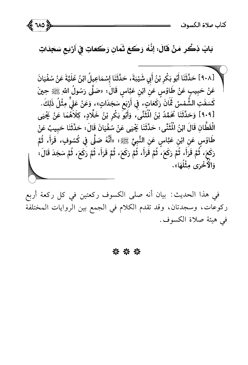 [٩٠٩] وَحَدَّثَنَا مُحَمَّدُ بْنُ الْمُثَنَّى، وَأَبُو بَكْرِ بْنُ خَلَّادٍ، كِلَاهُمَا عَنْ يَحْيَى الْقَطَّانِ قَالَ ابْنُ الْمُثَنَّى: حَدَّثَنَا يَحْيَى عَنْ سُفْيَانَ قَالَ: حَدَّثَنَا حَبِيبٌ عَنْ طَاوُسٍ عَنِ ابْنِ عَبَّاسٍ عَنِ النَّبِيِّ صلى الله عليه وسلم: ((أَنَّهُ صَلَّى فِي كُسُوفٍ، قَرَأَ، ثُمَّ رَكَعَ، ثُمَّ قَرَأَ، ثُمَّ رَكَعَ، ثُمَّ قَرَأَ، ثُمَّ رَكَعَ، ثُمَّ قَرَأَ، ثُمَّ رَكَعَ، ثُمَّ سَجَدَ قَالَ: وَالْأُخْرَى مِثْلُهَا)).