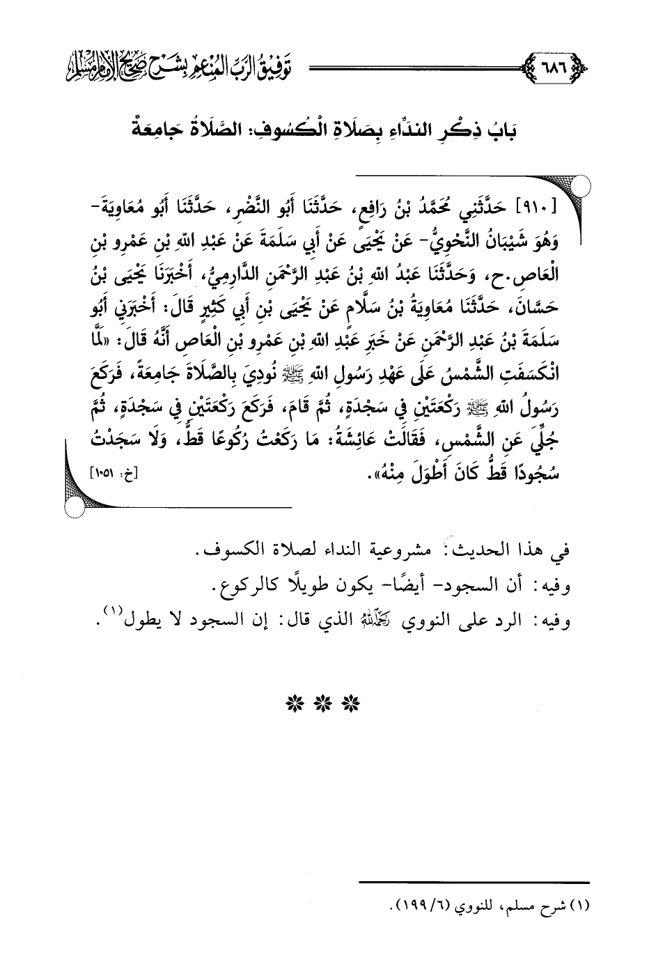 [٩١٠] حَدَّثَنِي مُحَمَّدُ بْنُ رَافِعٍ، حَدَّثَنَا أَبُو النَّضْرِ، حَدَّثَنَا أَبُو مُعَاوِيَةَ- وَهُوَ شَيْبَانُ النَّحْوِيُّ- عَنْ يَحْيَى عَنْ أَبِي سَلَمَةَ عَنْ عَبْدِ اللَّهِ بْنِ عَمْرِو بْنِ الْعَاصِ. ح، وَحَدَّثَنَا عَبْدُ اللَّهِ بْنُ عَبْدِ الرَّحْمَنِ الدَّارِمِيُّ، أَخْبَرَنَا يَحْيَى ابْنُ حَسَّانَ، حَدَّثَنَا مُعَاوِيَةُ بْنُ سَلَّامٍ عَنْ يَحْيَى بْنِ أَبِي كَثِيرٍ قَالَ: أَخْبَرَنِي أَبُو سَلَمَةَ بْنُ عَبْدِ الرَّحْمَنِ عَنْ خَبَرِ عَبْدِ اللَّهِ بْنِ عَمْرِو بْنِ الْعَاصِ أَنَّهُ قَالَ: ((لَمَّا انْكَسَفَتِ الشَّمْسُ عَلَى عَهْدِ رَسُولِ اللَّهِ صلى الله عليه وسلم نُودِيَ بِالصَّلَاةَ جَامِعَةً، فَرَكَعَ رَسُولُ اللَّهِ صلى الله عليه وسلم رَكْعَتَيْنِ فِي سَجْدَةٍ، ثُمَّ قَامَ، فَرَكَعَ رَكْعَتَيْنِ فِي سَجْدَةٍ، ثُمَّ جُلِّيَ عَنِ الشَّمْسِ، فَقَالَتْ عَائِشَةُ: مَا رَكَعْتُ رُكُوعًا قَطُّ، وَلَا سَجَدْتُ سُجُودًا قَطُّ كَانَ أَطْوَلَ مِنْهُ)).