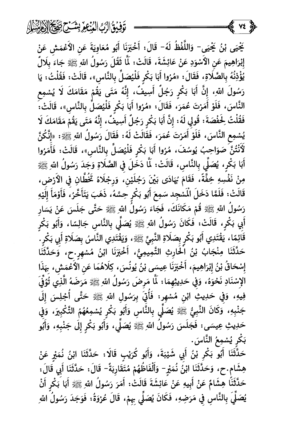 يَحْيَى بْنُ يَحْيَى- وَاللَّفْظُ لَهُ- قَالَ: أَخْبَرَنَا أَبُو مُعَاوِيَةَ عَنِ الأَعْمَشِ عَنْ إِبْرَاهِيمَ عَنِ الأَسْوَدِ عَنْ عَائِشَةَ، قَالَتْ: لَمَّا ثَقُلَ رَسُولُ اللَّهِ صلى الله عليه وسلم جَاءَ بِلَالٌ يُؤْذِنُهُ بِالصَّلَاةِ، فَقَالَ: ((مُرُوا أَبَا بَكْرٍ فَلْيُصَلِّ بِالنَّاسِ))، قَالَتْ: فَقُلْتُ: يَا رَسُولَ اللَّهِ، إِنَّ أَبَا بَكْرٍ رَجُلٌ أَسِيفٌ، إِنَّهُ مَتَى يَقُمْ مَقَامَكَ لَا يُسْمِعِ النَّاسَ، فَلَوْ أَمَرْتَ عُمَرَ، فَقَالَ: ((مُرُوا أَبَا بَكْرٍ فَلْيُصَلِّ بِالنَّاسِ))، قَالَتْ: فَقُلْتُ لِحَفْصَةَ: قُولِي لَهُ: إِنَّ أَبَا بَكْرٍ رَجُلٌ أَسِيفٌ، إِنَّهُ مَتَى يَقُمْ مَقَامَكَ لَا يُسْمِعِ النَّاسَ، فَلَوْ أَمَرْتَ عُمَرَ، فَقَالَتْ لَهُ: فَقَالَ رَسُولُ اللَّهِ صلى الله عليه وسلم: ((إِنَّكُنَّ لَأَنْتُنَّ صَوَاحِبُ يُوسُفَ، مُرُوا أَبَا بَكْرٍ فَلْيُصَلِّ بِالنَّاسِ))، قَالَتْ: فَأَمَرُوا أَبَا بَكْرٍ، يُصَلِّي بِالنَّاسِ، قَالَتْ: لَمَّا دَخَلَ فِي الصَّلَاةِ وَجَدَ رَسُولُ اللَّهِ صلى الله عليه وسلم مِنْ نَفْسِهِ خِفَّةً، فَقَامَ يُهَادَى بَيْنَ رَجُلَيْنِ، وَرِجْلَاهُ تَخُطَّانِ فِي الأَرْضِ، قَالَتْ: فَلَمَّا دَخَلَ الْمَسْجِد سَمِعَ أَبُو بَكْرٍ حِسَّهُ، ذَهَبَ يَتَأَخَّرُ، فَأَوْمَأَ إِلَيْهِ رَسُولُ اللَّهِ صلى الله عليه وسلم قُمْ مَكَانَكَ، فَجَاءَ رَسُولُ اللَّهِ صلى الله عليه وسلم حَتَّى جَلَسَ عَنْ يَسَارِ أَبِي بَكْرٍ، قَالَتْ: فَكَانَ رَسُولُ اللَّهِ صلى الله عليه وسلم يُصَلِّي بِالنَّاسِ جَالِسًا، وَأَبُو بَكْرٍ قَائِمًا، يَقْتَدِي أَبُو بَكْرٍ بِصَلَاةِ النَّبِيِّ صلى الله عليه وسلم، وَيَقْتَدِي النَّاسُ بِصَلَاةِ أَبِي بَكْرٍ.