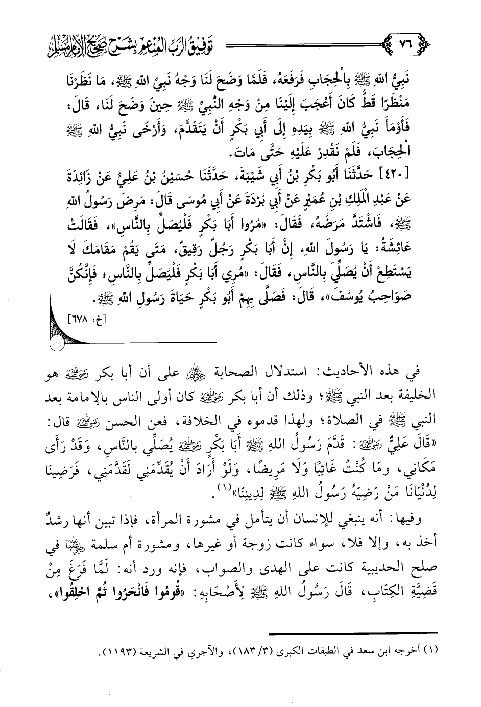 في هذه الأحاديث: استدلال الصحابة رضي الله عنهم على أن أبا بكر رضي الله عنه هو الخليفة بعد النبي صلى الله عليه وسلم؛ وذلك أن أبا بكر رضي الله عنه كان أولى الناس بالإمامة بعد النبي صلى الله عليه وسلم في الصلاة؛ ولهذا قدموه في الخلافة، فعن الحسن رضي الله عنه قال: ((قَالَ عَلِيٌّ رضي الله عنه: قَدَّمَ رَسُولُ اللهِ صلى الله عليه وسلم أَبَا بَكْرٍ رضي الله عنه يُصَلِّي بالنَّاسِ، وَقَدْ رَأَى مَكَانِي، ومَا كُنْتُ غَائِبًا وَلَا مَرِيضًا، وَلَوْ أَرَادَ أَنْ يُقَدِّمَنِي لَقَدَّمَنِي، فَرَضِينَا لِدُنْيَانَا مَنْ رَضِيَهُ رَسُولُ اللهِ صلى الله عليه وسلم لِدِينِنَا)) (¬١).