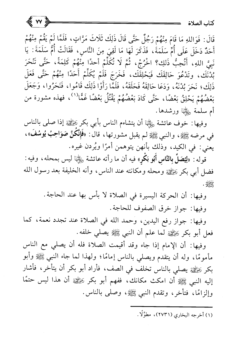 وفيها: أن الإمام إذا جاء وقد أقيمت الصلاة فله أن يصلي مع الناس مأمومًا، وله أن يتقدم ويصلي بالناس إمامًا؛ ولهذا لما جاء النبي صلى الله عليه وسلم وأبو بكر رضي الله عنه يصلي بالناس تخلف في الصف، فأراد أبو بكر أن يتأخر، فأشار إليه النبي صلى الله عليه وسلم أن امكث مكانك، ففهم أبو بكر رضي الله عنه أن هذا ليس حتمًا وإلزامًا، فتأخر، وتقدم النبي صلى الله عليه وسلم، وصلى بالناس.