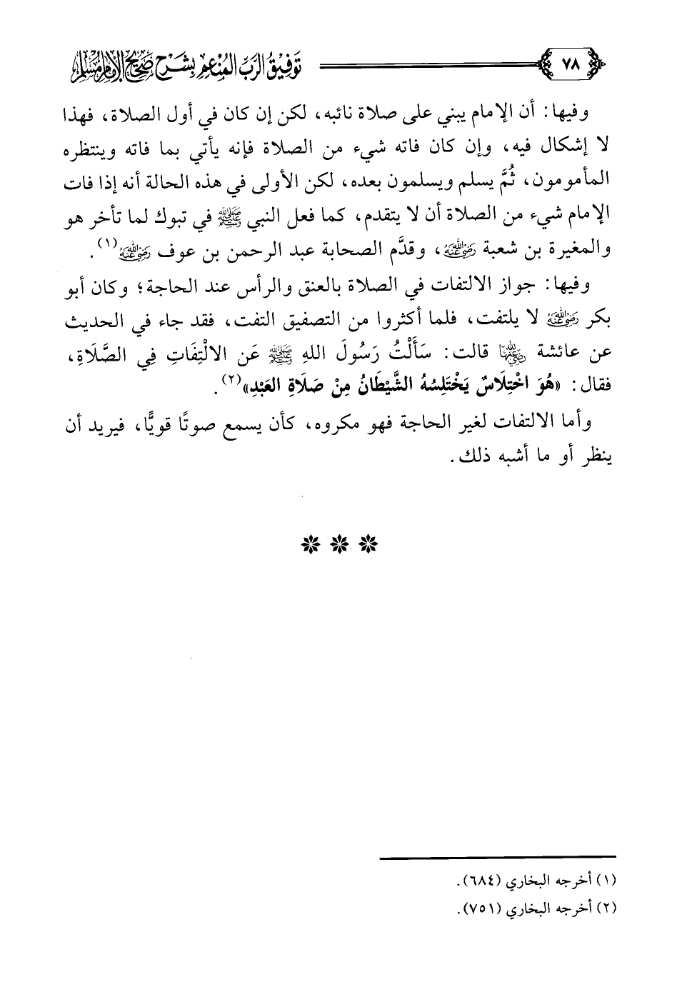 وفيها: جواز الالتفات في الصلاة بالعنق والرأس عند الحاجة؛ وكان أبو بكر رضي الله عنه لا يلتفت، فلما أكثروا من التصفيق التفت، فقد جاء في الحديث عن عائشة رضي الله عنها قالت: سَأَلْتُ رَسُولَ اللهِ صلى الله عليه وسلم عَن الالْتِفَاتِ فِي الصَّلَاةِ، فقال: ((هُوَ اخْتِلَاسٌ يَخْتَلِسُهُ الشَّيْطَانُ مِنْ صَلَاةِ العَبْدِ)) (¬٢).