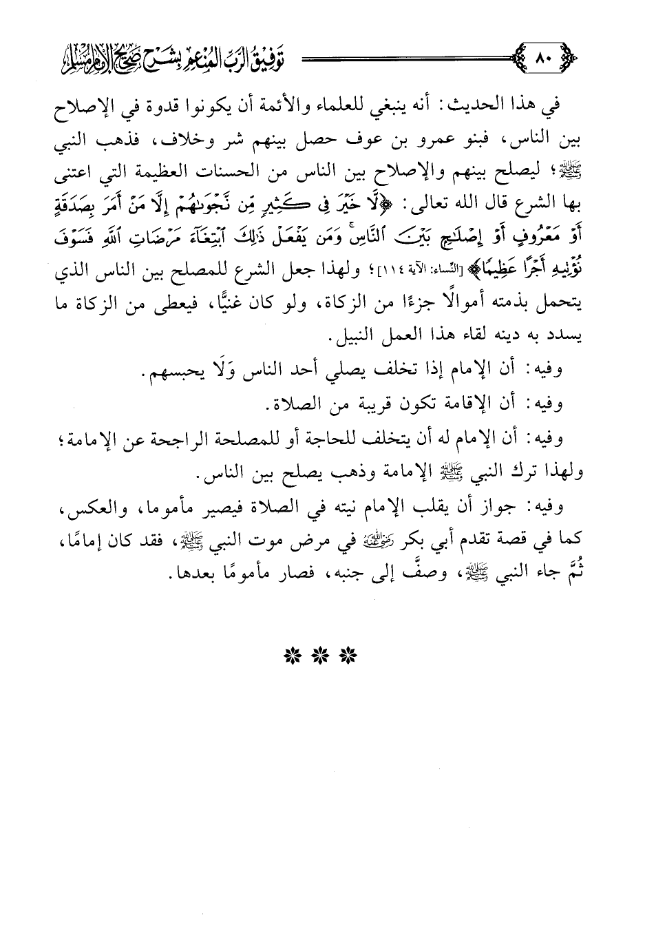 في هذا الحديث: أنه ينبغي للعلماء والأئمة أن يكونوا قدوة في الإصلاح بين الناس، فبنو عمرو بن عوف حصل بينهم شر وخلاف، فذهب النبي صلى الله عليه وسلم؛ ليصلح بينهم والإصلاح بين الناس من الحسنات العظيمة التي اعتنى بها الشرع قال الله تعالى: {لا خير في كثير من نجواهم إلا من أمر بصدقة أو معروف أو إصلاح بين الناس ومن يفعل ذلك ابتغاء وجه الله فسوف نؤتيه أجرًا عظيمًا}؛ ولهذا جعل الشرع للمصلح بين الناس الذي يتحمل بذمته أموالًا جزءًا من الزكاة، ولو كان غنيًّا، فيعطى من الزكاة ما يسدد به دينه لقاء هذا العمل النبيل.