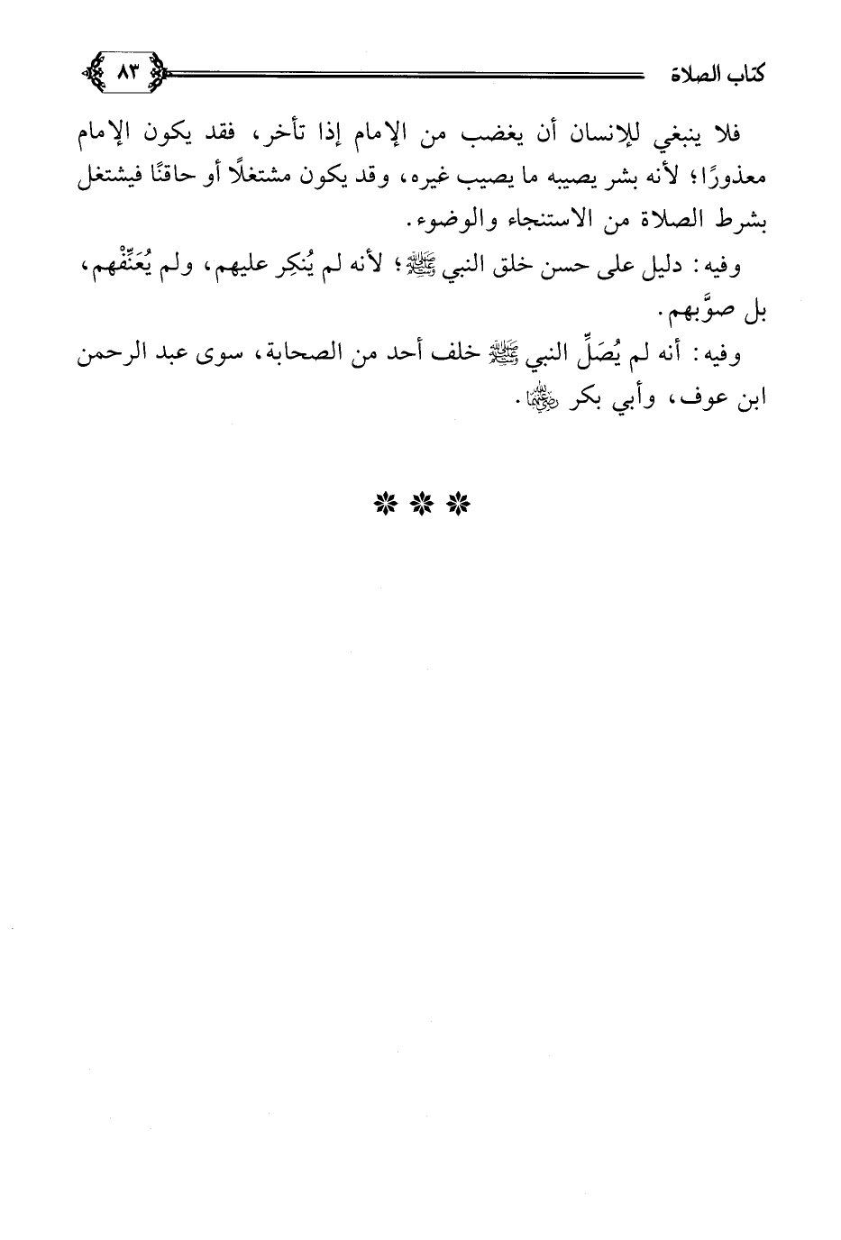 وفيه: أنه لم يُصَلِّ النبي صلى الله عليه وسلم خلف أحد من الصحابة، سوى عبد الرحمن بن عوف، وأبي بكر رضي الله عنهما.
