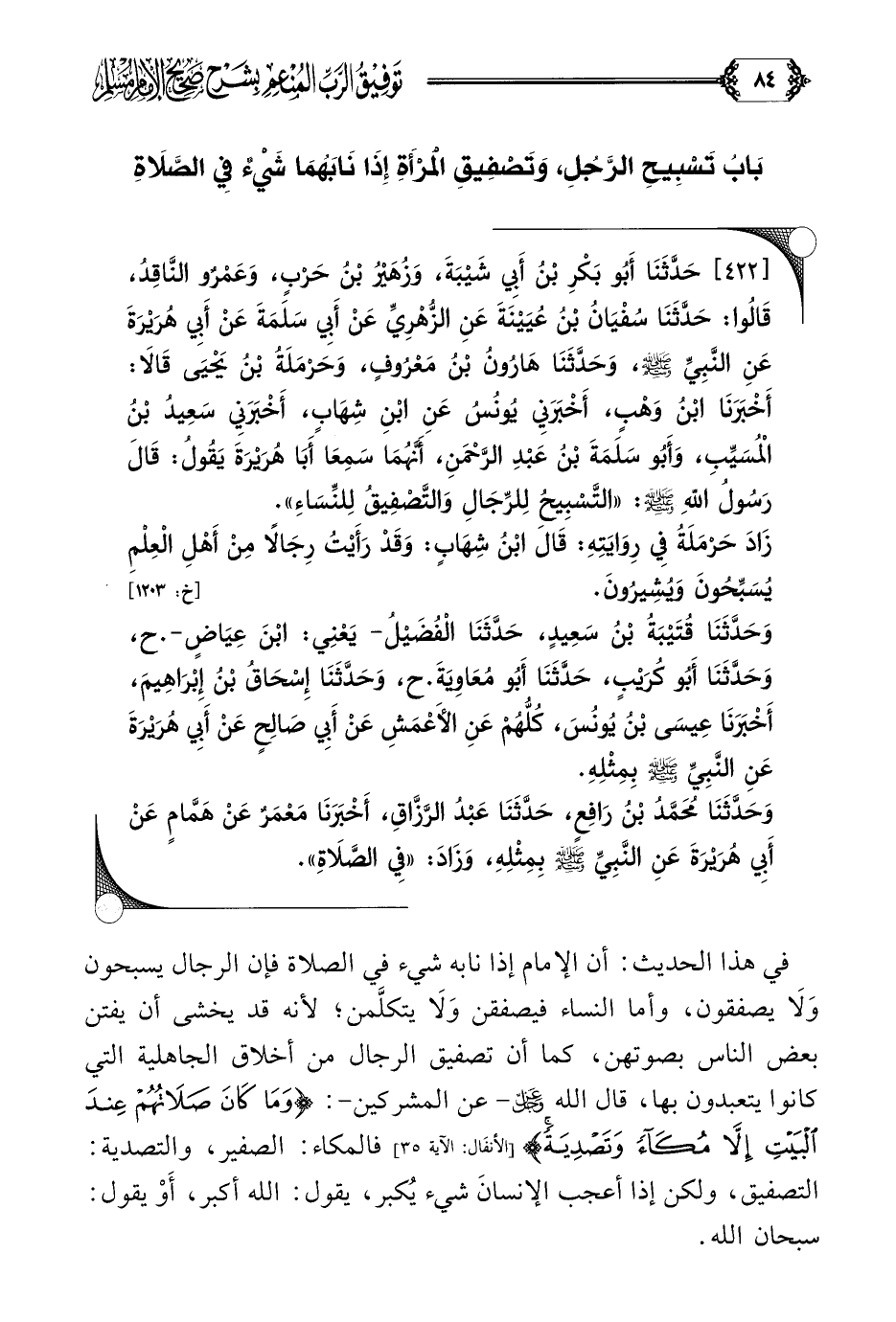[٤٢٢] حَدَّثَنَا أَبُو بَكْرِ بْنُ أَبِي شَيْبَةَ، وَزُهَيْرُ بْنُ حَرْبٍ، وَعَمْرٌو النَّاقِدُ، قَالُوا: حَدَّثَنَا سُفْيَانُ بْنُ عُيَيْنَةَ عَنِ الزُّهْرِيِّ عَنْ أَبِي سَلَمَةَ عَنْ أَبِي هُرَيْرَةَ عَنِ النَّبِيِّ صلى الله عليه وسلم، وَحَدَّثَنَا هَارُونُ بْنُ مَعْرُوفٍ، وَحَرْمَلَةُ بْنُ يَحْيَى قَالَا: أَخْبَرَنَا ابْنُ وَهْبٍ، أَخْبَرَنِي يُونُسُ عَنِ ابْنِ شِهَابٍ، أَخْبَرَنِي سَعِيدُ بْنُ الْمُسَيِّبِ، وَأَبُو سَلَمَةَ بْنُ عَبْدِ الرَّحْمَنِ، أَنَّهُمَا سَمِعَا أَبَا هُرَيْرَةَ يَقُولُ: قَالَ رَسُولُ اللَّهِ صلى الله عليه وسلم: ((التَّسْبِيحُ لِلرِّجَالِ وَالتَّصْفِيقُ لِلنِّسَاءِ)).