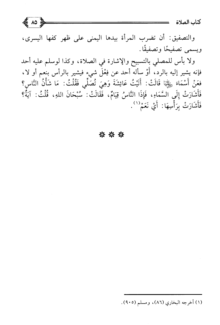 ولا بأس للمصلي بالتسبيح والإشارة في الصلاة، وكذا لو سلم عليه أحد فإنه يشير إليه بالرد، أَوْ سأله أحد عن فِعْلَ شيء فيشير بالرأس بنعم أو لا، فعَنْ أَسْمَاءَ رضي الله عنها قَالَتْ: أَتَيْتُ عَائِشَةَ وَهِيَ تُصَلِّي فَقُلْتُ: مَا شَأْنُ النَّاسِ؟ فَأَشَارَتْ إِلَى السَّمَاءِ، فَإِذَا النَّاسُ قِيَامٌ، فَقَالَتْ: سُبْحَانَ اللَّهِ، قُلْتُ: آيَةٌ؟ فَأَشَارَتْ بِرَأْسِهَا: أَيْ نَعَمْ (¬١).