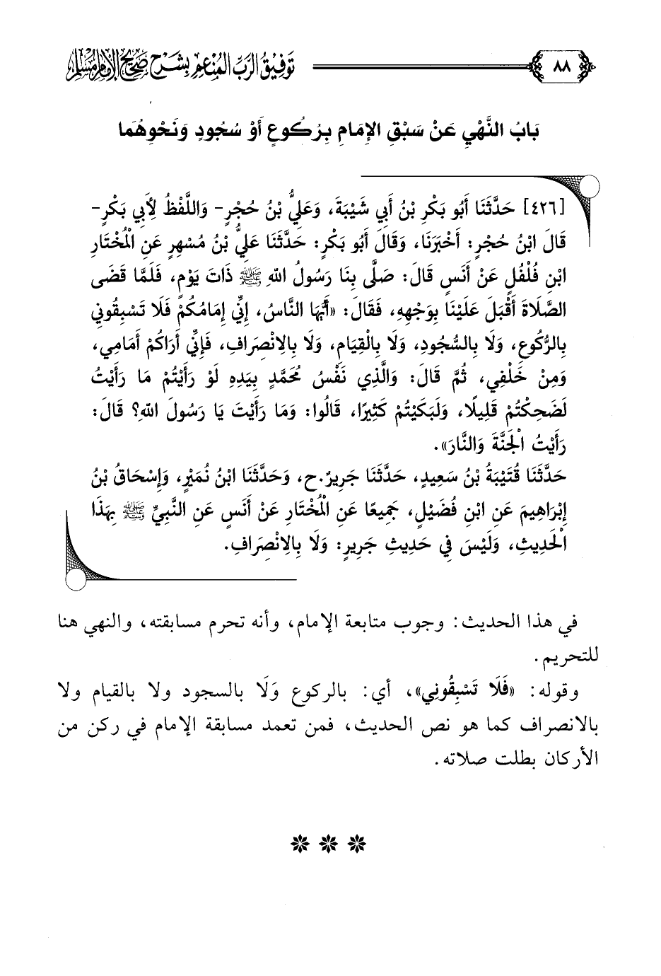 [٤٢٦] حَدَّثَنَا أَبُو بَكْرِ بْنُ أَبِي شَيْبَةَ، وَعَلِيُّ بْنُ حُجْرٍ- وَاللَّفْظُ لِأَبِي بَكْرٍ- قَالَ ابْنُ حُجْرٍ: أَخْبَرَنَا، وَقَالَ أَبُو بَكْرٍ: حَدَّثَنَا عَلِيُّ بْنُ مُسْهِرٍ عَنِ الْمُخْتَارِ بْنِ فُلْفُلٍ عَنْ أَنَسٍ قَالَ: صَلَّى بِنَا رَسُولُ اللَّهِ صلى الله عليه وسلم ذَاتَ يَوْمٍ، فَلَمَّا قَضَى الصَّلَاةَ أَقْبَلَ عَلَيْنَا بِوَجْهِهِ، فَقَالَ: ((أَيُّهَا النَّاسُ، إِنِّي إِمَامُكُمْ فَلَا تَسْبِقُونِي بِالرُّكُوعِ، وَلَا بِالسُّجُودِ، وَلَا بِالْقِيَامِ، وَلَا بِالِانْصِرَافِ، فَإِنِّي أَرَاكُمْ أَمَامِي، وَمِنْ خَلْفِي، ثُمَّ قَالَ: وَالَّذِي نَفْسُ مُحَمَّدٍ بِيَدِهِ لَوْ رَأَيْتُمْ مَا رَأَيْتُ لَضَحِكْتُمْ قَلِيلًا، وَلَبَكَيْتُمْ كَثِيرًا، قَالُوا: وَمَا رَأَيْتَ يَا رَسُولَ اللَّهِ؟ قَالَ: رَأَيْتُ الْجَنَّةَ وَالنَّارَ)).