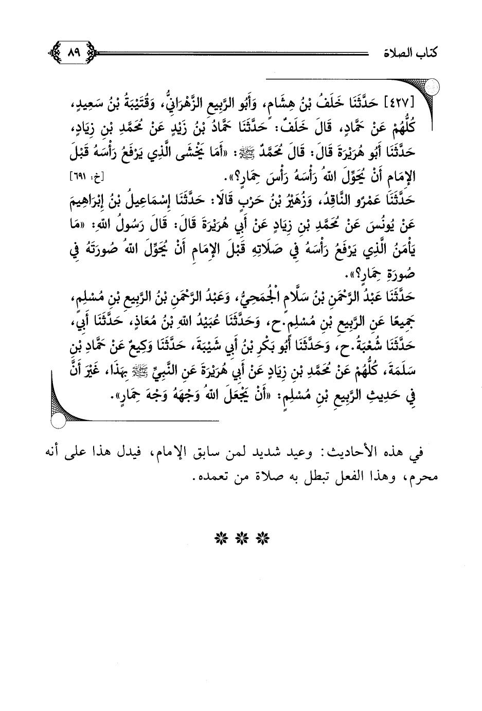 [٤٢٧] حَدَّثَنَا خَلَفُ بْنُ هِشَامٍ، وَأَبُو الرَّبِيعِ الزَّهْرَانِيُّ، وَقُتَيْبَةُ بْنُ سَعِيدٍ، كُلُّهُمْ عَنْ حَمَّادٍ، قَالَ خَلَفٌ: حَدَّثَنَا حَمَّادُ بْنُ زَيْدٍ عَنْ مُحَمَّدِ بْنِ زِيَادٍ، حَدَّثَنَا أَبُو هُرَيْرَةَ قَالَ: قَالَ مُحَمَّدٌ صلى الله عليه وسلم: ((أَمَا يَخْشَى الَّذِي يَرْفَعُ رَأْسَهُ قَبْلَ الإِمَامِ أَنْ يُحَوِّلَ اللَّهُ رَأْسَهُ رَأْسَ حِمَارٍ؟ )).