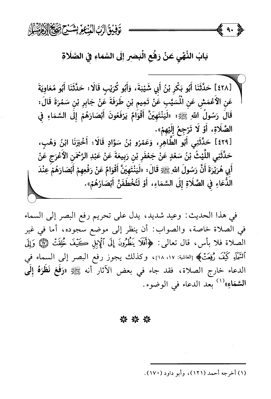 في هذا الحديث: وعيد شديد، يدل على تحريم رفع البصر إلى السماء في الصلاة خاصة، والصواب: أن ينظر إلى موضع سجوده، أما في غير الصلاة فلا بأس، قال تعالى: {أفلا ينظرون إلى الإبل كيف خلفت وإلى السماء كيف رفعت}، وكذلك يجوز رفع البصر إلى السماء في الدعاء خارج الصلاة، فقد جاء في بعض الآثار أنه صلى الله عليه وسلم ((رَفَعَ نَظَرَهُ إِلَى السَّمَاءِ)) (¬١) بعد الدعاء في الوضوء.