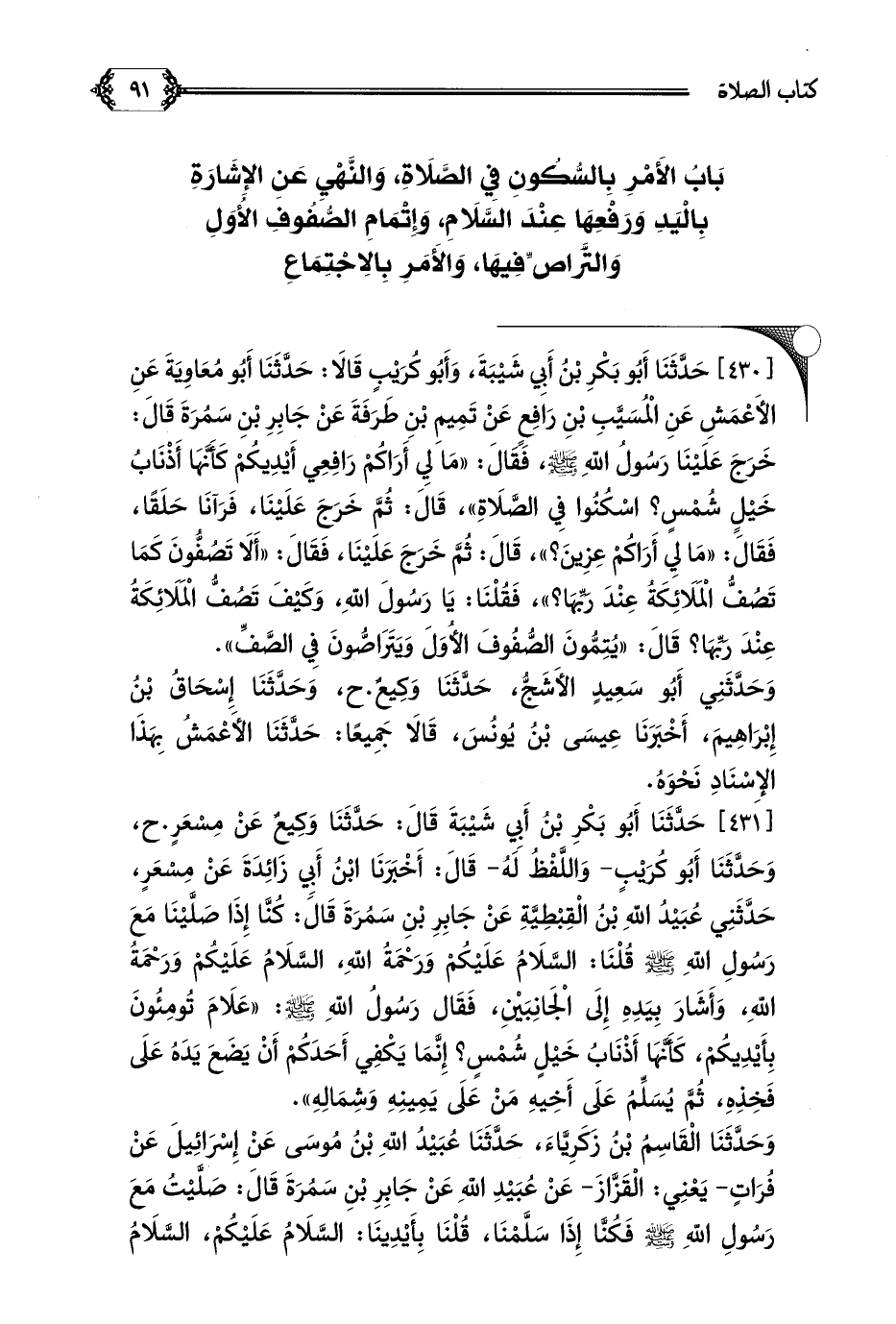 بَابُ الأَمْرِ بِالسُّكُونِ فِي الصَّلَاةِ، وَالنَّهْيِ عَنِ الإِشَارَةِ بِالْيَدِ وَرَفْعِهَا عِنْدَ السَّلَامِ، وَإِتْمَامِ الصُّفُوفِ الأُوَلِ وَالتَّرَاصِّ فِيهَا، وَالأَمَرِ بِالِاجْتِمَاعِ