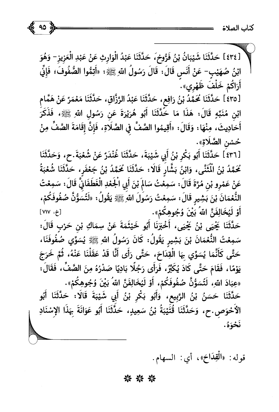 حَدَّثَنَا يَحْيَى بْنُ يَحْيَى، أَخْبَرَنَا أَبُو خَيْثَمَةَ عَنْ سِمَاكِ بْنِ حَرْبٍ قَالَ: سَمِعْتُ النُّعْمَانَ بْنَ بَشِيرٍ يَقُولُ: كَانَ رَسُولُ اللَّهِ صلى الله عليه وسلم يُسَوِّي صُفُوفَنَا، حَتَّى كَأَنَّمَا يُسَوِّي بِهَا الْقِدَاحَ، حَتَّى رَأَى أَنَّا قَدْ عَقَلْنَا عَنْهُ، ثُمَّ خَرَجَ يَوْمًا، فَقَامَ حَتَّى كَادَ يُكَبِّرُ، فَرَأَى رَجُلًا بَادِيًا صَدْرُهُ مِنَ الصَّفِّ، فَقَالَ: ((عِبَادَ اللَّهِ، لَتُسَوُّنَّ صُفُوفَكُمْ، أَوْ لَيُخَالِفَنَّ اللَّهُ بَيْنَ وُجُوهِكُمْ)).
