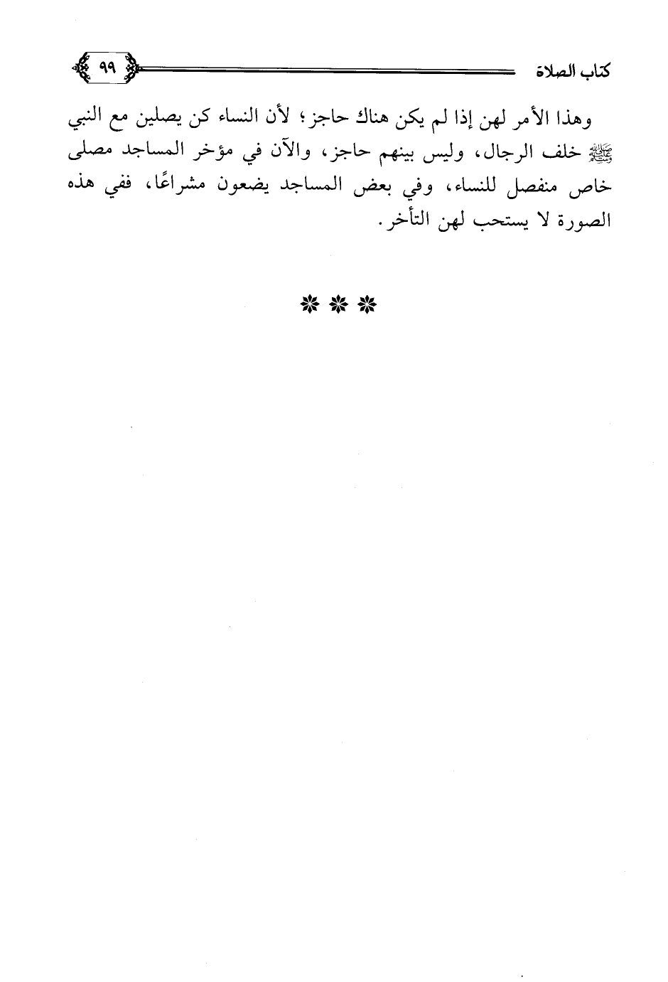 وهذا الأمر لهن إذا لم يكن هناك حاجز؛ لأن النساء كن يصلين مع النبي صلى الله عليه وسلم خلف الرجال، وليس بينهم حاجز، والآن في مؤخر المساجد مصلى خاص منفصل للنساء، وفي بعض المساجد يضعون مشراعًا، ففي هذه الصورة لا يستحب لهن التأخر.