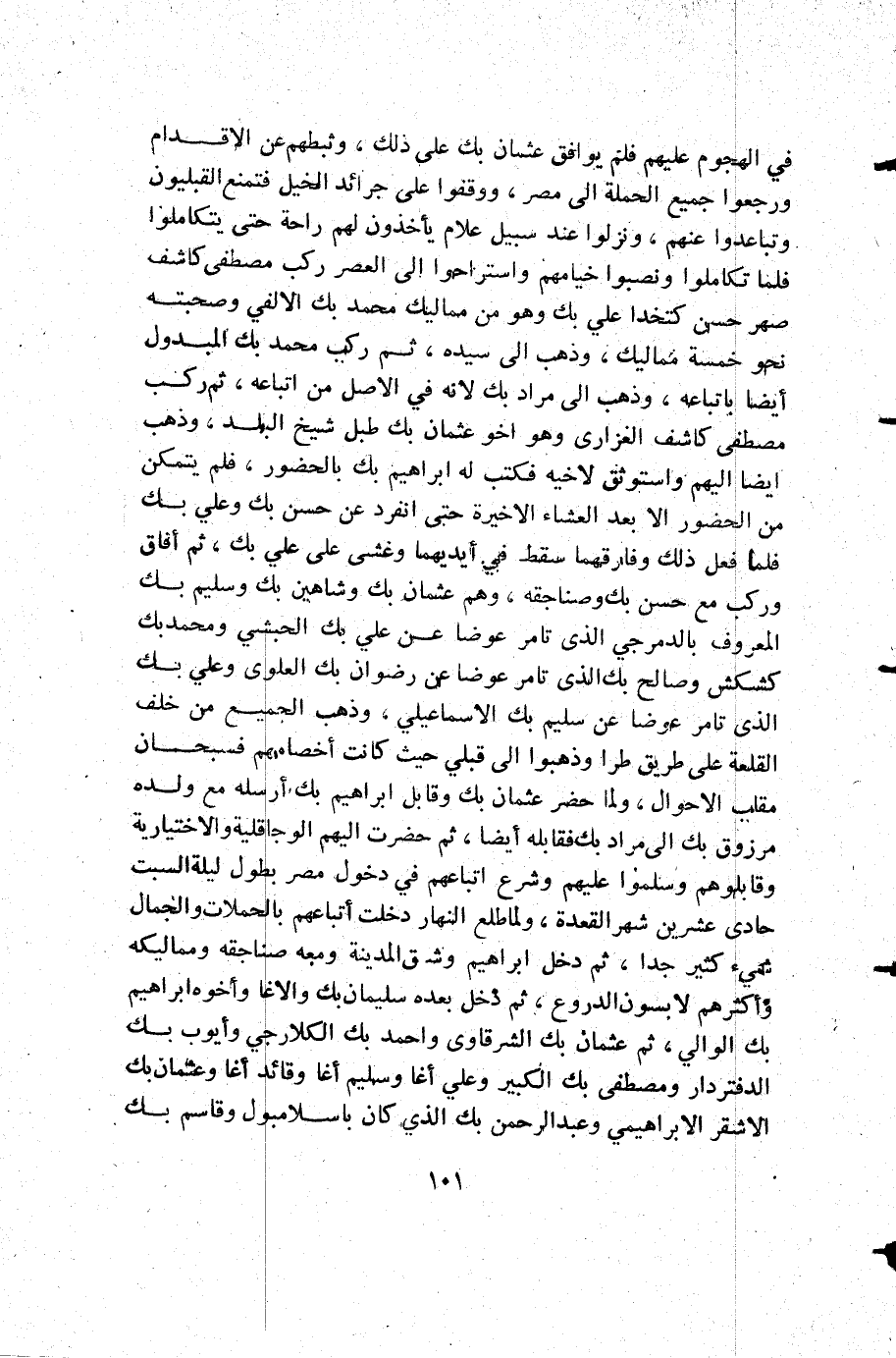 في الهجوم عليهم فلم يوافق عثمان بك على ذلك وثبطهم عن الاقدام ورجعوا جميع الحملة إلى مصر ووقفوا على جرائد الخيل فتمنع القبليون وتباعدوا عنهم ونزلوا عند سبيل علام يأخذون لهم راحة حتى يتكاملوا فلما تكاملوا ونصبوا خيامهم واستراحوا إلى العصر ركب مصطفى كاشف صهر حسن كتخدا علي بك وهو من مماليك محمد بك الألفي وصحبته نحو خمسة مماليك وذهب إلى سيده ثم ركب محمد بك المبدول أيضا باتباعه وذهب إلى مراد بك لأنه في الأصل من اتباعه ثم ركب مصطفى كاشف الغزاري وهو أخو عثمان بك طبل شيخ البلد وذهب أيضا إليهم واستوثق لاخيه فكتب له إبراهيم بك بالحضور فلم يتمكن من الحضور إلا بعد العشاء الاخيرة حتى انفرد عن حسن بك وعلي بك فلما فعل ذلك وفارقهما سقط في أيديهما وغشى على علي بك ثم أفاق وركب مع حسن بك وصناجقه وهم عثمان بك وشاهين بك وسليم بك المعروف بالدمرجي الذي تآمر عوضا عن علي بك الحبشي ومحمد بك كشكش وصالح بك الذي تآمر عوضا عن رضوان بك العلوي وعلي بك الذي تآمر عوضا عن سليم بك الإسماعيلي وذهب الجميع من خلف القلعة على طريق طرا وذهبوا إلى قبلي حيث كانت اخصامهم فسبحان مقلب الأحوال ولما حضر عثمان بك وقابل إبراهيم بك ارسله مع ولده مرزوق بك إلى مراد بك فقابله أيضا ثم حضرت إليهم الوجاقلية والاختيارية وقابلوهم وسلموا عليهم وشرع اتباعهم في دخول مصر بطول ليلة السبت حادي عشرين شهر القعدة ولما طلع النهار دخلت أتباعهم بالحملات والجمال شيء كثير جدا ثم دخل إبراهيم وشق المدينة ومعه صناجقة ومماليكه وأكثرهم لابسون الدروع ثم دخل بعده سليمان بك والأغا واخوه إبراهيم بك الوالي ثم عثمان بك الشرقاوي وأحمد بك الكلارجي وأيوب بك الدفتردار ومصطفى بك الكبير وعلي أغا وسليم أغا وقائد أغا وعثمان بك الاشقر الإبراهيمي وعبد الرحمن بك الذي كان باسلامبول وقاسم بك