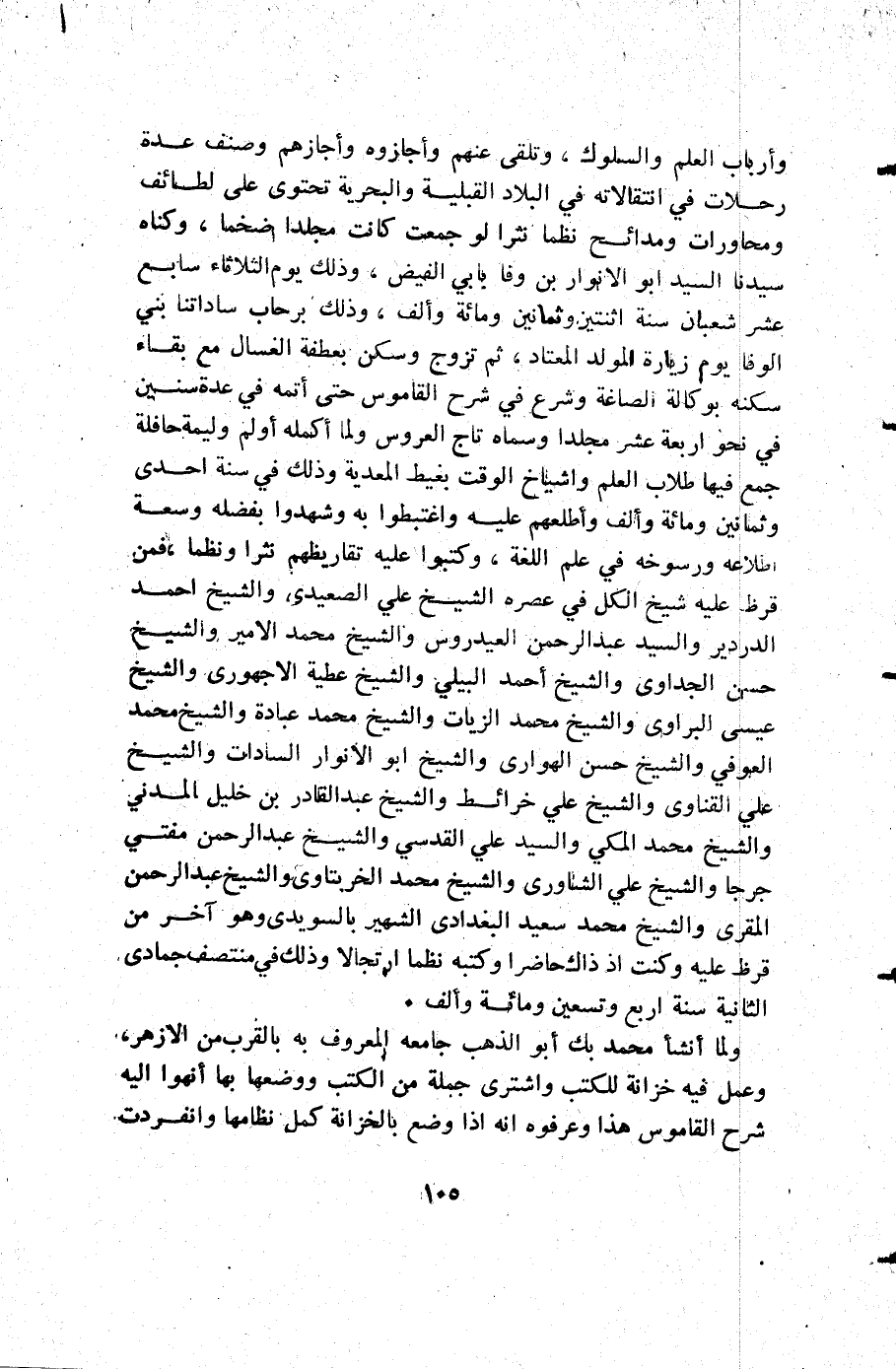 وأرباب العلم والسلوك وتلقى عنهم وأجازوه وأجازهم وصنف عدة رحلات في انتقالاته في البلاد القبلية والبحرية تحتوي على لطائف ومحاورات ومدائح نظما نثرا لو جمعت كانت مجلدا ضخما وكناه سيدنا السيد أبو الأنوار بن وفا بابي الفيض وذلك يوم الثلاثاء سابع عشر شعبان سنة اثنتين وثمانين ومائة وألف وذلك برحاب ساداتنا بني الوفا يوم زيارة المولد المعتاد ثم تزوج وسكن بعطفة الغسال مع بقاء سكنه بوكالة الصاغة وشرع في شرح القاموس حتى أتمه في عدة سنين في نحو أربعة عشر مجلدا وسماه تاج العروس ولما أكمله أولم وليمة حافلة جمع فيها طلاب العلم وأشياخ الوقت بغيط المعدية وذلك في سنة احدى وثمانين ومائة وألف وأطلعهم عليه وأغتبطوا به وشهدوا بفضله وسعة اطلاعه ورسوخه في علم اللغة وكتبوا عليه تقاريظهم نثرا ونظما فمن قرظ عليه شيخ الكل في عصره الشيخ علي الصعيدي والشيخ أحمد الدردير والسيد عبد الرحمن العيدروس والشيخ محمد الأمير والشيخ حسن الجداوي والشيخ أحمد البيلي والشيخ عطية الاجهوري والشيخ عيسى البراوي والشيخ محمد الزيات والشيخ محمد عبادة والشيخ محمد العوفي والشيخ حسن الهواري والشيخ أبو الأنوار السادات والشيخ علي القناوي والشيخ علي خرائط والشيخ عبد القادر بن خليل المدني والشيخ محمد المكي والسيد علي القدسي والشيخ عبد الرحمن مفتي جرجا والشيخ علي الشاوري والشيخ محمد الخربتاوي والشيخ عبد الرحمن المقرى والشيخ محمد سعيد البغدادي الشهير بالسويدي وهو آخر من قرظ عليه وكنت إذ ذاك حاضرا وكتبه نظما ارتجالا وذلك في منتصف جمادى الثانية سنة أربع وتسعين ومائة وألف.