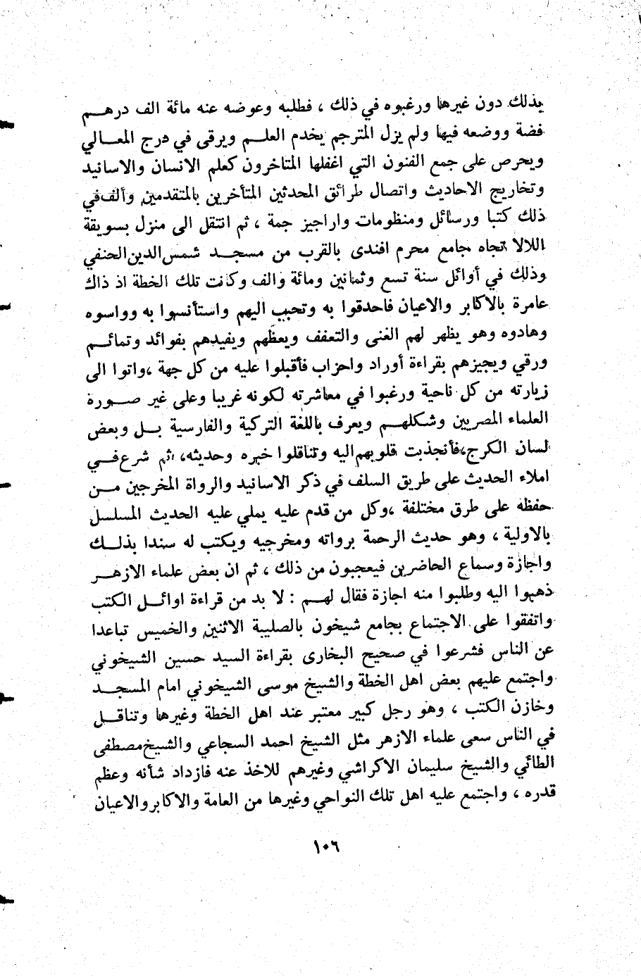 بذلك دون غيرها ورغبوه في ذلك فطلبه وعوضه عنه مائة ألف درهم فضة ووضعه فيها ولم يزل المترجم يخدم العلم ويرقى في درج المعالي ويحرص على جمع الفنون التي أغفلها المتأخرون كعلم الإنسان والأسانيد وتخاريج الأحاديث واتصال طرائق المحدثين المتأخرين بالمتقدمين وألف في ذلك كتبا ورسائل ومنظومات وأراجيز جمة ثم انتقل إلى منزل بسويقة اللالا تجاه جامع محرم أفندي بالقرب من مسجد شمس الدين الحنفي وذلك في أوائل سنة تسع وثمانين ومائة وألف وكانت تلك الخطة إذ ذاك عامرة بالأكابر والأعيان فأحدقوا به وتحبب إليهم واستأنسوا به وواسوه وهادوه وهو يظهر لهم الغنى والتعفف ويعظهم ويفيدهم بفوائد وتمائم ورقي ويجيزهم بقراءة أوراد واحزاب فأقبلوا عليه من كل جهة واتوا إلى زيارته من كل ناحية ورغبوا في معاشرته لكونه غريبا وعلى غير صورة العلماء المصريين وشكلهم ويعرف باللغة التركية والفارسية بل وبعض لسان الكرج فأنجذبت قلوبهم إليه وتناقلوا خبره وحديثه ثم شرع في املاء الحديث على طريق السلف في ذكر الأسانيد والرواة المخرجين من حفظه على طرق مختلفة وكل من قدم عليه يملي عليه الحديث المسلسل بالاولية وهو حديث الرحمة برواته ومخرجيه ويكتب له سندا بذلك وإجازة وسماع الحاضرين فيعجبون من ذلك ثم أن بعض علماء الأزهر ذهبوا إليه وطلبوا منه إجازة فقال لهم: لا بد من قراءة أوائل الكتب واتفقوا على الاجتماع بجامع شيخون بالصليبة الإثنين والخميس تباعدا عن الناس فشرعوا في صحيح البخاري بقراءة السيد حسين الشيخوني واجتمع عليهم بعض أهل الخطة والشيخ موسى الشيخوني إمام المسجد وخازن الكتب وهو رجل كبير معتبر عند أهل الخطة وغيرها وتناقل في الناس سعى علماء الأزهر مثل الشيخ أحمد السجاعي والشيخ مصطفى الطائي والشيخ سليمان الأكراشي وغيرهم للأخذ عنه فازداد شأنه وعظم قدره واجتمع عليه أهل تلك النواحي وغيرها من العامة والاكابر والأعيان