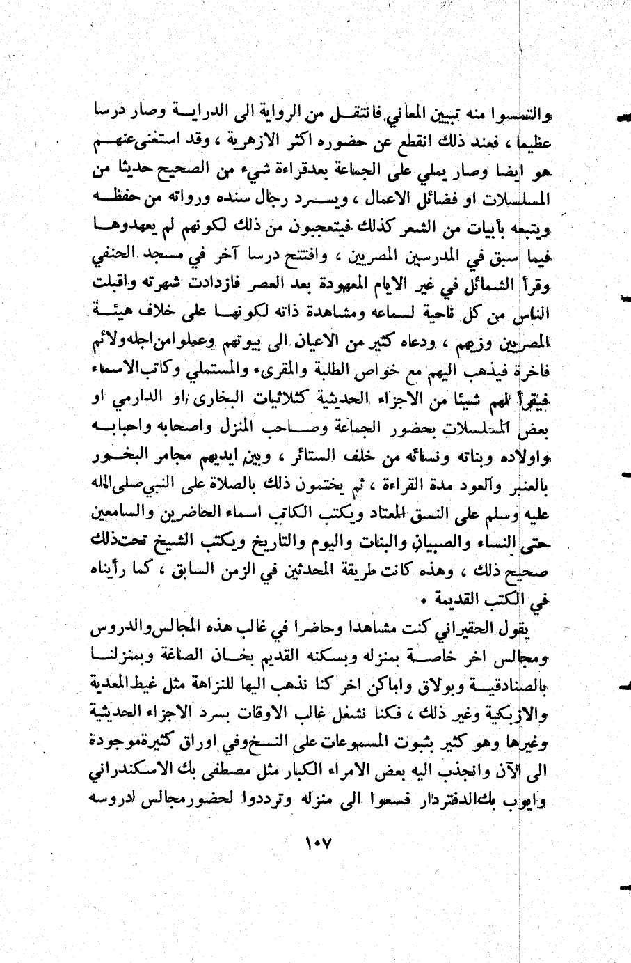 والتمسوا منه تبيين المعاني فانتقل من الرواية إلى الدراية وصار درسا عظيما فعند ذلك انقطع عن حضوره أكثر الأزهرية وقد استغنى عنهم هو أيضا وصار يملي على الجماعة بعد قراءة شيء من الصحيح حديثا من المسلسلات أو فضائل الأعمال ويسرد رجال سنده ورواته من حفظه ويتبعه بأبيات من الشعر كذلك فيتعجبون من ذلك لكونهم لم يعهدوها فيما سبق في المدرسين المصريين وافتتح درسا آخر في مسجد الحنفي وقرأ الشمائل في غير الأيام المعهودة بعد العصر فازدادت شهرته وأقبلت الناس من كل ناحية لسماعه ومشاهدة ذاته لكونها على خلاف هيئة المصريين وزيهم ودعاه كثير من الأعيان إلى بيوتهم وعملوا من اجله ولائم فاخرة فيذهب إليهم مع خواص الطلبة والمقرىء والمستملي وكاتب الأسماء فيقرأ لهم شيئا من الاجزاء الحديثية كثلاثيات البخاري أو الدارمي أو بعض المسلسلات بحضور الجماعة وصاحب المنزل واصحابه واحبابه وأولاده وبناته ونسائه من خلف الستائر وبين أيديهم مجامر البخور بالعنبر والعود مدة القراءة ثم يختمون ذلك بالصلاة على النبي صلى الله عليه وسلم على النسق المعتاد ويكتب الكاتب أسماء الحاضرين والسامعين حتى النساء والصبيان والبنات واليوم والتاريخ ويكتب الشيخ تحت ذلك صحيح ذلك وهذه كانت طريقة المحدثين في الزمن السابق كما رأيناه في الكتب القديمة.