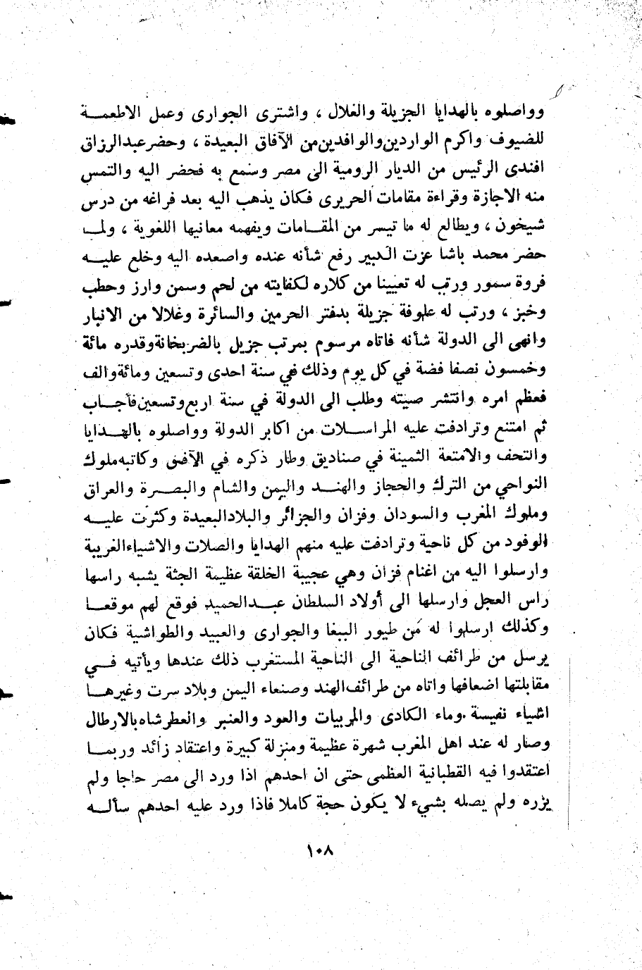 وواصلوه بالهدايا الجزيلة والغلال واشترى الجواري وعمل الاطعمة للضيوف وأكرم الواردين والوافدين من الافاق البعيدة وحضر عبد الرزاق أفندي الرئيس من الديار الرومية إلى مصر وسمع به فحضر إليه والتمس منه الاجازة وقراء مقامات الحريري فكان يذهب إليه بعد فراغه من درس شيخون ويطالع له ما تيسر من المقامات ويفهمه معانيها اللغوية ولما حضر محمد باشا عزت الكبير رفع شأنه عنده واصعده إليه وخلع عليه فروة سمور ورتب له تعيينا من كلاره لكفايته من لحم وسمن وأرز وحطب وخبر ورتب له علوفة جزيلة بدفتر الحرمين والسائرة وغلالا من الانبار وأنهى إلى الدولة شانه فأتاه مرسوم بمرتب جزيل بالضربخانة وقدره مائة وخمسون نصفا فضة في كل يوم وذلك في سنة احدى وتسعين ومائة وألف فعظم أمره وانتشر صيته وطلب إلى الدولة في سنة أربع وتسعين فأجاب ثم امتنع وترادفت عليه المراسلات من أكابر الدولة وواصلوه بالهدايا والتحف والأمتعة الثمينة في صناديق وطار ذكره في الافق وكاتبه ملوك النواحي من الترك والحجاز والهند واليمن والشام والبصرة والعراق وملوك المغرب والسودان وفزان والجزائر والبلاد البعيدة وكثرت عليه الوفود من كل ناحية وترادفت عليه منهم الهدايا والصلات والأشياء الغريبة وأرسلوا إليه من أغنام فزان وهي عجيبة الخلقة عظيمة الجثة يشبه رأسها راس العجل وأرسلها إلى أولاد السلطان عبد الحميد فوقع لهم موقعا وكذلك ارسلوا له من طيور الببغا والجواري والعبيد والطواشية فكان يرسل من طرائف الناحية إلى الناحية المستغرب ذلك عندها ويأتيه في مقابلتها اضعافها وأتاه من طرائف الهند وصنعاء اليمن وبلاد سرت وغيرها أشياء نفيسة وماء الكادي والمربيات والعود والعنبر والعطرشاه بالارطال وصار له عند أهل المغرب شهرة عظيمة ومنزلة كبيرة واعتقاد زائد وربما اعتقدوا فيه القطبانية العظمى حتى أن احدهما إذا ورد إلى مصر حاجا ولم يزره ولم يصله بشيء لا يكون حجه كاملا فإذا ورد عليه احدهم سأله