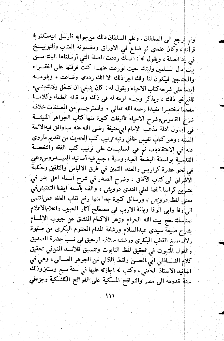 ولم ترجع إلى السلطان وعلم السلطان ذلك من جوابه فأرسل إليه مكتوبا قرأته وكان عندي ثم ضاع في الأوراق ومضمونه العتاب والتوبيخ في رد الصلة ويقول له: إنك رددت الصلة التي ارسلناها اليك من بيت مال المسلمين وليتك حيث تورعت عنها كنت فرقتها على الفقراء والمحتاجين فيكون لنا ولك اجر ذلك إلا انك رددتها وضاعت ويلومه أيضا على شرحه كتاب الإحياء ويقول له: كان ينبغي أن تشغل وقتك بشيء نافع غير ذلك ويذكر وجه لومه له في ذلك وما قاله العلماء وكلاما مفحما مختصرا مفيدا رحمه الله تعالى وللمترجم من المصنفات خلاف شرح القاموس وشرح الاحياء تأليفات كثيرة منها كتاب الجواهر المنيفة في اصول ادلة مذهب الإمام أبي حنيفة رضي الله عنه مما وافق فيه الأئمة الستة وهو كتاب نفيس حافل رتبه ترتيب كتب الحديث من تقديم ما روى عنه في الأعتقاديات ثم في العمليات على ترتيب كتب الفقه والنفحة القدسية بواسطة البضعة العيدروسية جمع فيه أسانيد العيدروس وهي في نحو عشرة كراريس والعقد الثمين في طرق الالباس والتلقين وحكمة الأشراق إلى كتاب الآفاق وشرح الصدر في شرح أسماء أهل بدر في عشرين كراسا ألفها لعلي أفندي درويش وألف بأسمه أيضا التفتيش في معنى لفظ درويش ورسائل كثيرة جدا منها رفع نقاب الخفا عمن انتمى إلى وفا وابى الوفا وبلغة الاريب في مصطلح آثار الحبيب وأعلام الأعلام بمناسك حج بيت الله الحرام وزهر الأكمام المنشق عن جيوب الإلمام بشرح صيغة سيدي عبد السلام ورشفة المدام المختوم البكري من صفوة زلال صيغ القطب البكري ورشف سلاف الرحيق في نسب حضرة الصديق والقول المثبوت في تحقيق لفظ التابوت وتنسيق قلائد المنن في تحقيق كلام الشاذلي أبي الحسن ولقط اللالى من الجوهر الغالي وهي في اسانيد الأستاذ الحفني وكتب له إجازته عليها في سنة سبع وستين وذلك سنة قدومه إلى مصر والنوافح المسكية علىالفوائح الكشكية وجزء في