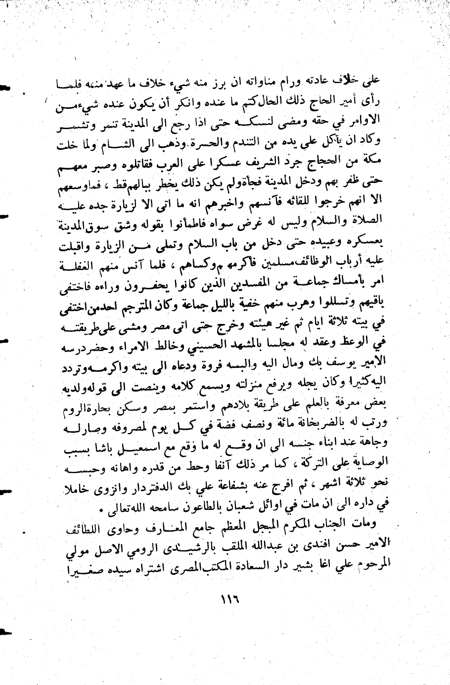 على خلاف عادته ورام مناواته أن برز منه شيء خلاف ما عهد منه فلما رأى أمير الحاج ذلك الحال كتم ما عنده وانكر أن يكون عنده شيء من الاوامر في حقه ومضى لنسكه حتى إذا رجع إلى المدينة تنمر وتشمر وكاد أن يأكل على يده من التندم والحسرة وذهب إلى الشام ولما خلت مكة من الحجاج جرد الشريف عسكرا على العرب فقاتلوه وصبر معهم حتى ظفر بهم ودخل المدينة فجأة ولم يكن ذلك يخطر ببالهم قط فما وسعهم إلا أنهم خرجوا للقائه فآنسهم وأخبرهم أنه ما أتى إلا لزيارة جده عليه الصلاة والسلام وليس له غرض سواه فاطمأنوا بقوله وشق سوق المدينة بعسكره وعبيده حتى دخل من باب السلام وتملى من الزيارة وأقبلت عليه أرباب الوظائف مسلمين فأكرمهم وكساهم فلما أنس منهم الغفلة أمر بأمساك جماعة من المفسدين الذين كانوا يحفرون وراءه فاختفى باقيهم وتسللوا وهرب منهم خفية بالليل جماعة وكان المترجم أجد من اختفى في بيته ثلاثة أيام ثم غير هيئه وخرج حتى أتى مصر ومشى على طريقته في الوعظ وعقد له مجلسا بالمشهد الحسيني وخالط الأمراء وحضر درسه الأمير يوسف بك ومال إليه والبسه فروة ودعاه إلى بيته وأكرمه وتردد إليه كثيرا وكان يجله ويرفع منزلته ويسمع كلامه وينصت إلى قوله: ولديه بعض معرفة بالعلم على طريقة بلادهم واستمر بمصر وسكن بحارة الروم ورتب له بالضربخانة مائة ونصف فضة في كل يوم لمصروفه وصار له وجاهة عند ابناء جنسه إلى أن وقع له ما وقع مع إسمعيل باشا بسبب الوصاية على التركة كما مر ذلك آنفا وحط من قدره واهانه وحبسه نحو ثلاثة اشهر ثم افرج عنه بشفاعة علي بك الدفتردار وانزوى خاملا في داره إلى أن مات في أوائل شعبان بالطاعون سامحه الله تعالى.