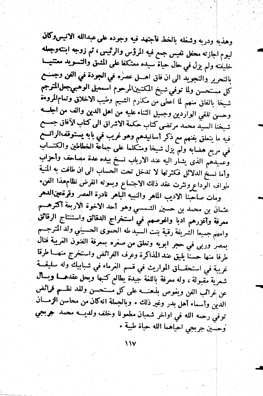 ومات صاحبنا الأديب الماهر والنبيه الباهر نادرة العصر وقرة عين الدهر عثمان بن محمد بن حسين الشمسي وهو أجد الاخوة الأربعة أكثرهم معرفة وأغزرهم أدبا وأغوصهم في استخراج الدقائق واستنتاج الرقائق وامهم جميعا الشريفة رقية بنت السيد طه الحموي الحسيني ولد المترجم بمصر وربى في حجر ابويه وتعلق من صغره بمعرفة الفنون الغريبة فنال طرفا منها حسنا يليق عند المذاكرة وعرف الفرائض واستخرج منها طرقا غريبة في استحقاق المواريث في قسم الغرماء في شبابيك وله سليقة شعرية مقبولة وله معرفة باللغة جيدة يطالع كتبها ويحل عقدها ويسأل عن غرائب الفن ويغوص بذهنه على كل مستحسن ولقد نظم فرائض الدين وأسماء أهل بدر وغير ذلك وبالجملة أنه كان من محاسن الزمان توفي رحمة الله في اواخر شعبان مطعونا وخلف ولديه محمد جربجي وحسن جربجي احياهما الله حياة طيبة