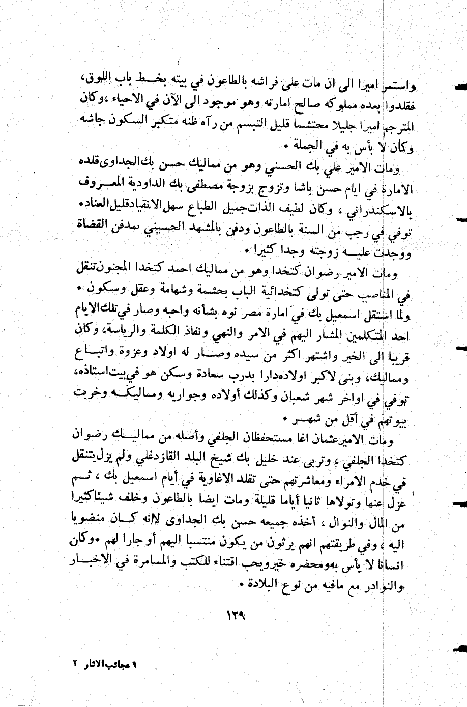 ومات الأمير عثمان آغا مستحفظان الجلفي وأصله من مماليك رضوان كتخدا الجلفي وتربى عند خليل بك شيخ البلد القازدغلي ولم يزل يتنقل في خدم الأمراء ومعاشرتهم حتى تقلد الاغاوية في أيام إسمعيل بك ثم عزل عنها وتولاها ثانيا أياما قليلة ومات أيضا بالطاعون وخلف شيئا كثيرا من المال والنوال أخذه جميعه حسن بك الجداوي لأنه كان منضوبا إليه وفي طريقتهم أنهم يرثون من يكون منتسبا إليهم أو جارا لهم وكان إنسانا لا بأس به ومحضره خير ويحب اقتناء للكتب والمسامرة في الأخبار والنوادر مع ما فيه من نوع البلادة