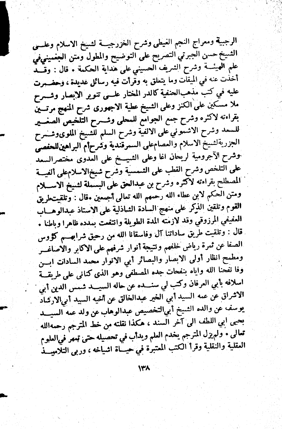 الرجيبه ومعراج النجم الغيطي وشرح الخزرجية لشيخ الإسلام وعلى الشيخ حسن الجبرتي التصريح على التوضيح والمطول ومتن الجغميني في علم الهيئة وشرح الشريف الحسيني علىهداية الحكمة قال وقد أخذت عنه في الميقات وما يتعلق به وقرأت فيه رسائل عديدة وحضرت عليه في كتب مذهب الحنفية كالدر المختار على تنوير الأبصار وشرح ملا مسكين على الكنز وعلى الشيخ عطية الاجهوري شرح المنهج مرتين بقراءته لاكثر وشرح جمع الجوامع للمحلى وشرح التلخيص الصغير للسعد وشرح الاشموني على الألفية وشرح السلم للشيخ الملوي وشرح الجزرية لشيخ الإسلام والعصام على السمرقندية وشرح أم البراهين للحفصى وشرح الاجرومية لريحان اغا وعلى الشيخ على العدوى مختصر السعد على التلخص وشرح القطب على الشمسية وشرح شيخ الإسلام على ألفية المصطلح بقراءته لاكثره وشرح بن عبد الحق على البسملة لشيخ الإسلام ومتن الحكم لابن عطاء الله رحمهم الله تعالى أجمعين قال: وتلقيت طريق القوم وتلقين الذكر على منهج السادة الشاذلية على الأستاذ عبد الوهاب العفيفي المرزوقي وقد لازمته المدة الطويلة وانتفعت بمدده ظاهرا وباطنا قال وتلقيت طريق ساداتنا آل وفا سقانا الله من رحيق شرابهم كؤوس الصفا عن ثمرة رياض خلفهم ونتيجة أنوار شرفهم على الأكابر والأصاغر ومطمح انظار أولى الأبصار والبصائر أبي الأنوار محمد السادات ابن وفا نفحنا الله واياه بنفحات جده المصطفى وهو الذي كناني على طريقة اسلافه بأبي العرفان وكتب لي سنده عن حاله السيد شمس الدين أبي الأشراق عن عمه السيد أبي الخير عبد الخالق عن أخيه السيد أبي الارشاد يوسف عن والده الشيخ أبي التخصيص عبد الوهاب عن ولد عمه السيد بحيى أبي اللطف إلى آخر السند هكذا نقلته من خط المترجم رحمه الله تعالى ولم يزل المترجم يخدم العمل ويدأب في تحصيله حتى تمهر في العلوم العقلية والنقلية وقرأ الكتب المعتبرة في حياة أشياخه وربى التلاميذ