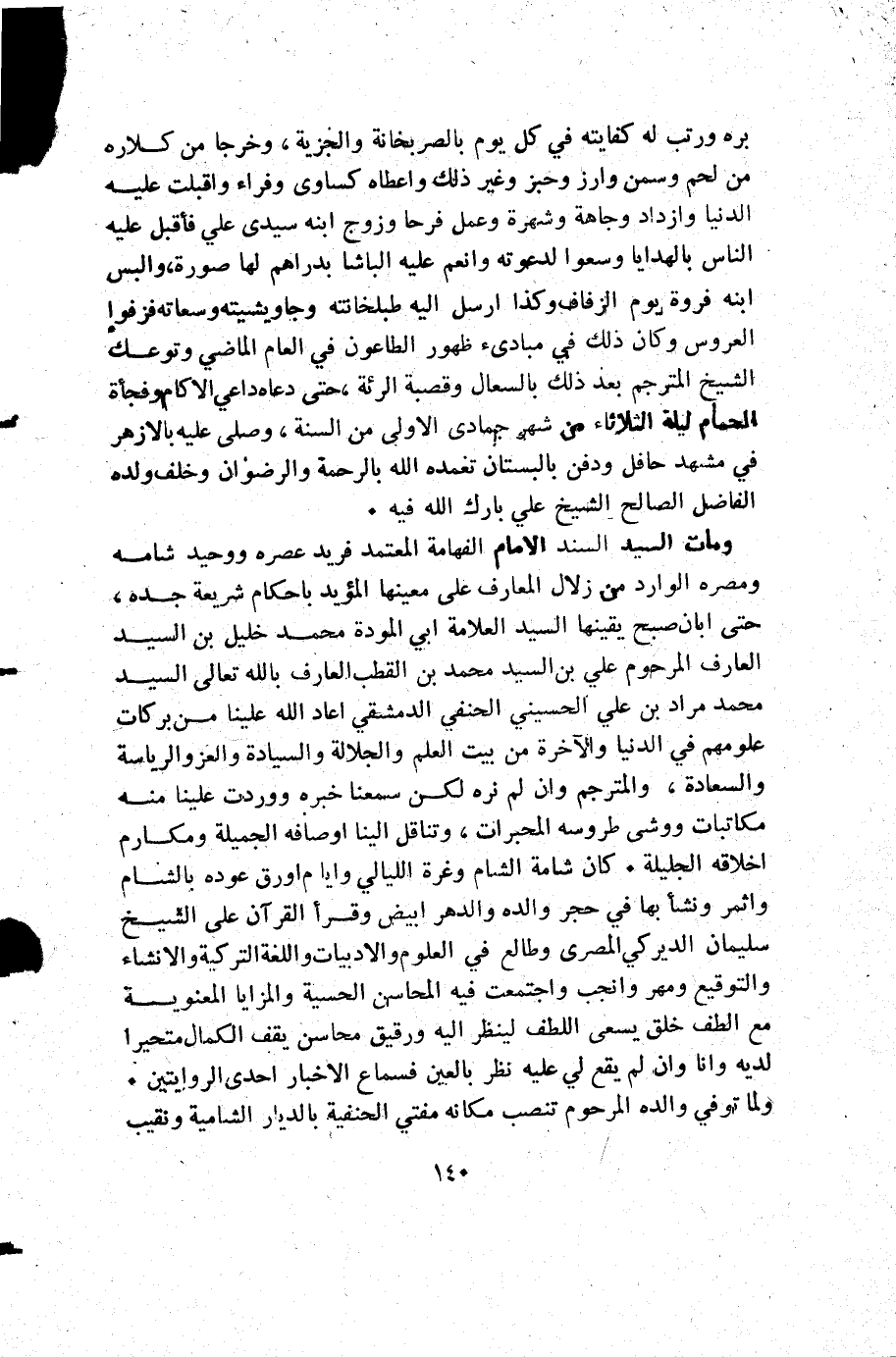 ومات السيد السند الإمام الفهامة المعتمد فريد عصره ووحيد شامه ومصره الوارد من زلال المعارف على معينها المؤيد بأحكام شريعة جده حتى ابان صبح يقينها السيد العلامة أبي المودة محمد خليل بن السيد العارف المرحوم علي بن السيد محمد بن القطب العارف بالله تعالى السيد محمد مراد بن علي الحسيني الحنفي الدمشقي اعاد الله علينا من بركاته علومهم في الدنيا والاخرة من بيت العلم والجلالة والسيادة والعز والرياسة والسعادة والمترجم وأن لم نره لكن سمعنا خبره ووردت علينا منه مكاتبات ووشى طروسة المحبرات وتناقل إلينا أوصافه الجميلة ومكارم اخلاقه الجليلة وكان شامة الشام وغرة الليالي وأيام اورق عوده بالشام واثمر ونشأ بها في حجر والده والدهر أبيض وقرأ القرآن على الشيخ سليمان الديركي المصري وطالع في العلوم والادبيات واللغة التركية والانشاء والتوقيع ومهر وانجب واجتمعت فيه المحاسن الحسية والمزايا المعنوية مع الطف خلق يسعى اللطف لينظر إليه ورقيق محاسن يقف الكمال متحيرا لديه وأنا وأن لم يقع لي عليه نظر بالعين فسماع الأخبار احدى الروايتين ولما توفي والده المرحوم تنصب مكانه مفتي الحنفية بالديار الشامية ونقيب