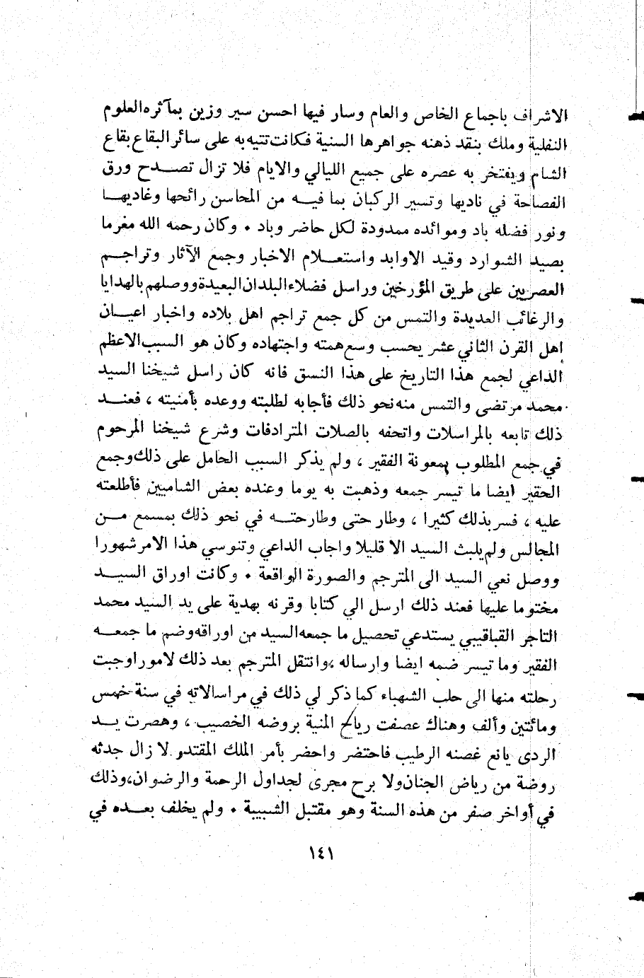 الإشراف باجماع الخاص والعام وسار فيها احسن سير وزين بمآثره العلوم النفلية وملك بنقد ذهنه جواهرها السنية فكانت تتيه به على سائر البقاع بقاع الشام ويفتخر به عصره على جميع الليالي والأيام فلا تزال تصدح ورق الفصاحة في ناديها وتسير الركبان بما فيه من المحاسن رائحها وغاديها ونور فضله باد وموائده ممدودة لكل حاضر وباد وكان رحمه الله مغرما بصيد الشوارد وقيد الاوابد واستعلام الأخبار وجمع الاثار وتراجم العصريين على طريق المؤرخين وراسل فضلاء البلدان البعيدة ووصلهم بالهدايا والرغائب العديدة والتمس من كل جمع تراجم أهل بلاده وأخبار أعيان أهل القرن الثاني عشر يحسب وسع همته واجتهاده وكان هو السبب الأعظم الداعي لجمع هذا التاريخ على هذا النسق فإنه كان راسل شيخنا السيد محمد مرتضى والتمس منه نحو ذلك فأجابه لطلبته ووعده بأمنيته فعند ذلك تابعه بالمراسلات واتحفه بالصلات المترادفات وشرع شيخنا المرحوم في جمع المطلوب بمعونة الفقير ولم يذكر السبب الحامل على ذلك وجمع الحقير أيضا ما تيسر جمعه وذهبت به يوما وعنده بعض الشاميين فأطلعته عليه فسر بذلك كثيرا وطار حتى وطارحته في نحو ذلك بمسمع من المجالس ولم يلبث السيد إلا قليلا وأجاب الداعي وتنوسي هذا الأمر شهورا ووصل نعي السيد إلى المترجم والصورة الواقعة وكانت أوراق السيد مختوما عليها فعند ذلك أرسل إلي كتابا وقرنه بهدية على يد السيد محمد التاجر القباقيبي يستدعي تحصيل ما جمعه السيد من اوراقه وضم ما جمعه الفقير وما تيسر ضمه أيضا وإرساله وانتقل المترجم بعد ذلك لامور اوجبت رحلته منها إلى حلب الشهباء كما ذكر لي ذلك في مراسلاته في سنة خمس ومائتين وألف وهناك عصفت رياح المنية بروضه الخصيب وهصرت يد الردي يانع غصنه الرطيب فاحتضر وأحضر بأمر الملك المقتدر لا زال جدثه روضة من رياض الجنان ولا برح مجرى لجداول الرحمة والرضوان وذلك في اواخر صفر من هذه السنة وهو مقتبل الشبيبة ولم يخلف بعده في