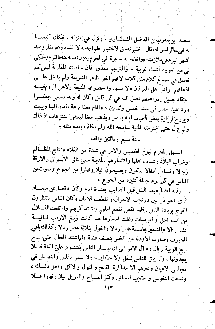 وفيه أيضا هبط النيل قبل الصليب بعشرة أيام وكان ناقصا عن ميعاد الري نحو ذراعين فارتجت الأحوال وانقطعت الأمال وكان الناس ينتظرون الفرج بزيادة النيل فلما نقص انقطع أملهم واشتد كربهم وارتفعت الغلال من السواحل والعرصات وغلت اسعارها عما كانت وبلغ الإردب ثمانية عشر ريالا والشعير بخمسة عشر ريالا والفول بثلاثة عشر ريالا وكذلك باقي الحبوب وصارت الأوقية من الخبز بنصف فضة ثم اشتد الحال حتى بيع ربع الويبة بريال وآل الأمر إلى أن صار الناس يفتشون على الغلة فلا يجدونها ولم يبق للناس شغل ولا حكاية ولا سمر بالليل والنهار في مجالس الأعيان وغيرهم إلا مذاكرة القمح والفول والأكل ونحو ذلك وشحت النفوس واحتجب المساتير وكثر الصياح والعويل ليلا ونهارا فلا